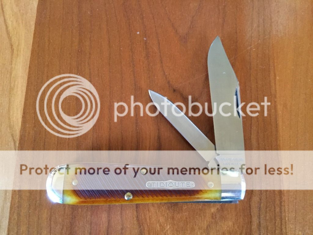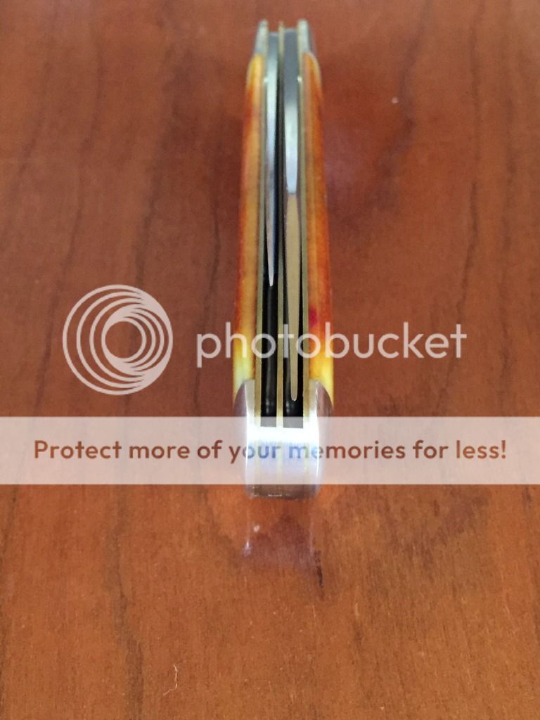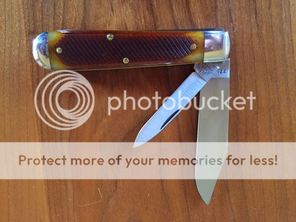 I bought this because I love the color of the handle--it reminds me of the USA Old Timer series. This knife is absolutely NIT: never used, sharpened, or put in a pocket. Only taken out to photograph. Blades are centered and the pull feels 6-ish to me.