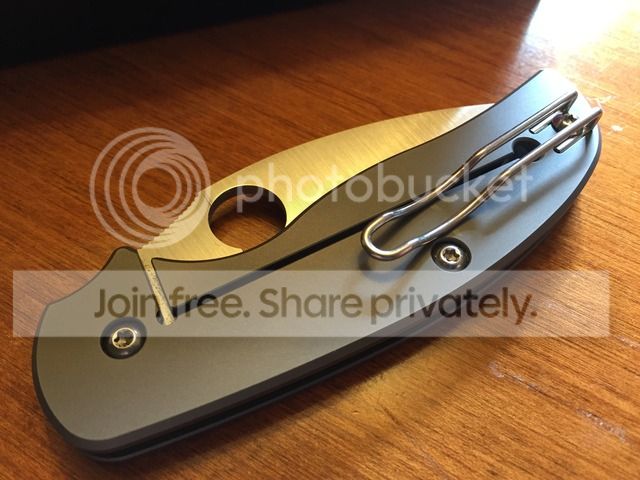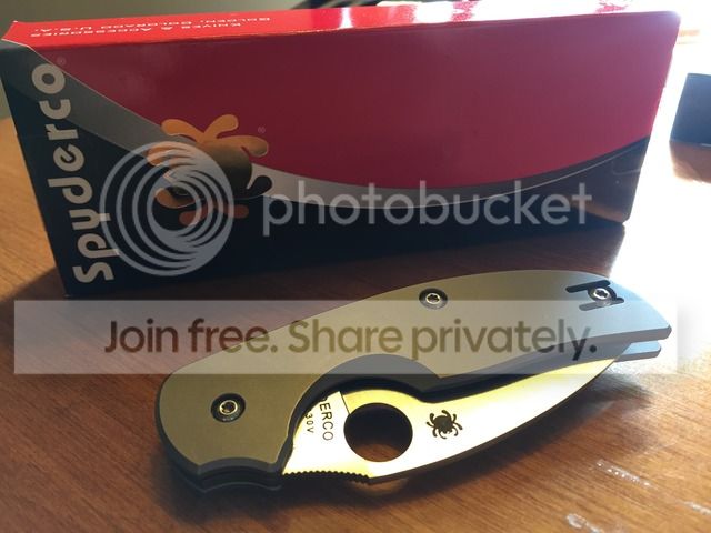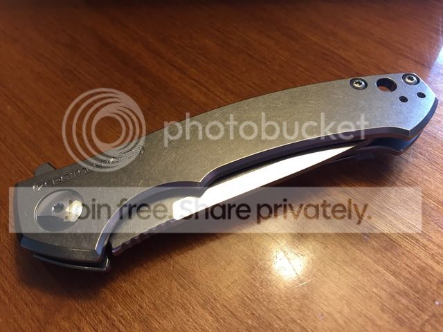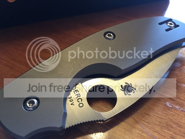 Next up is a very lightly carried "never cut anything" Spyderco Sage 2 full titanium frame lock. This knife is about as close to new as a lightly carried knife can be. Absolutely no marks on the blade. The lock side is perfect. The presentation side of the scales has just a little bit of very minor discoloration right above the Spydie hole from being in the pocket and rubbing against my wallet, but it needs to be held at just the right angle to see them and the rest of the presentation side is perfect, it's just a half once wear rub by the Spydie hole. I tried to get the perfect angle in my photos to show the light rub marks. They may even be able to be polished out but I'm not going to mess with it. Just holding it in your hand and it looks new. Comes in the factory box with all paperwork and plastic sleeve.