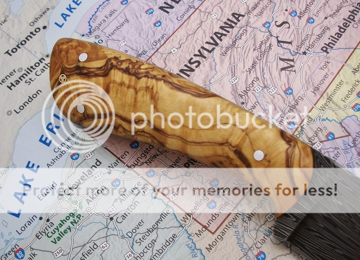 This one has the improved ergo style handle in intense Stabilized Olivewood, paired with L.FOWLER Reverse "W" Pattern Damascus (1095/15N20).
