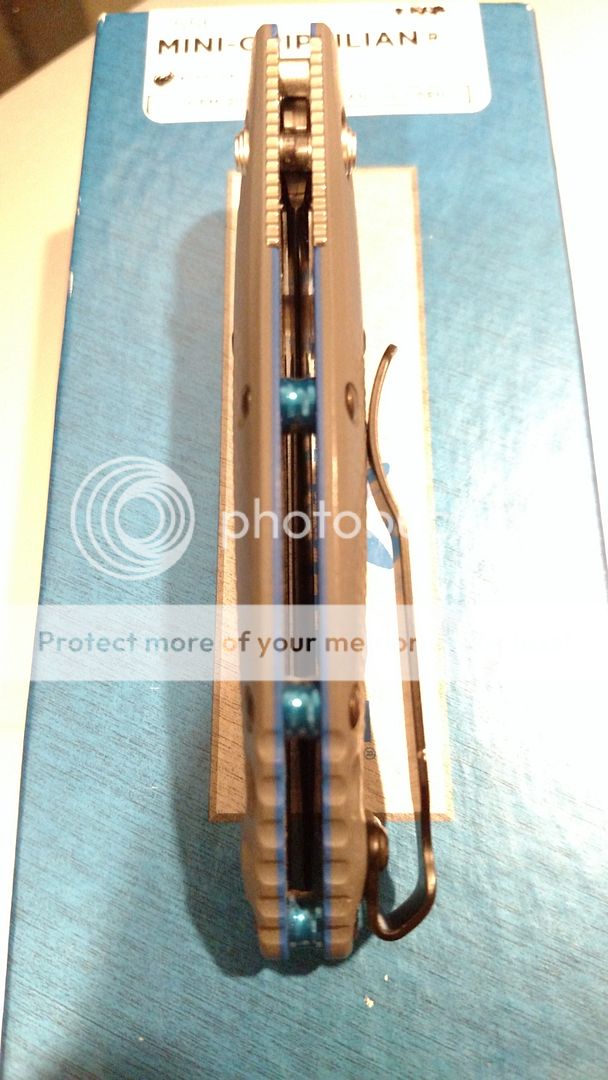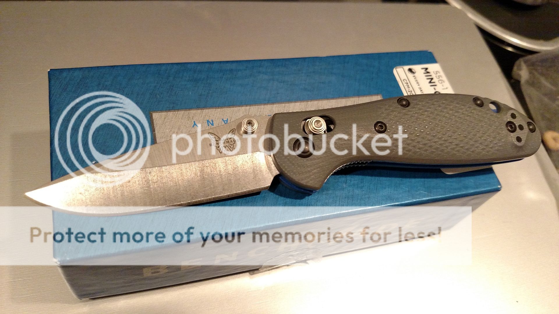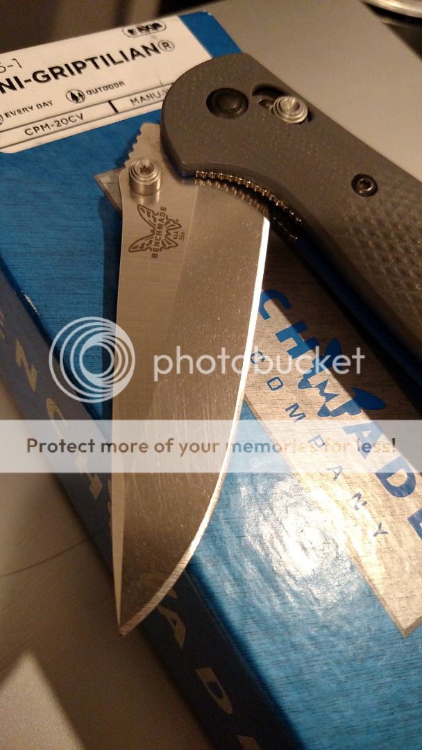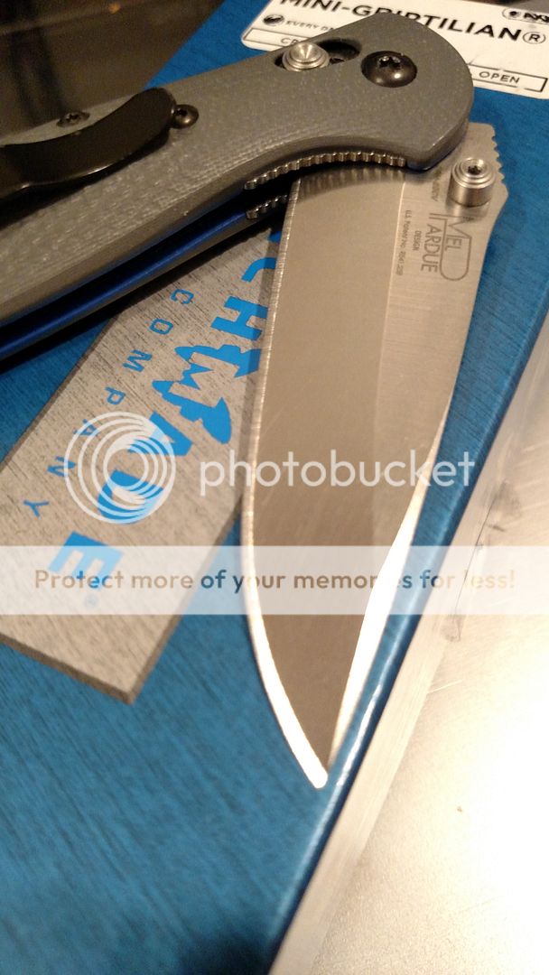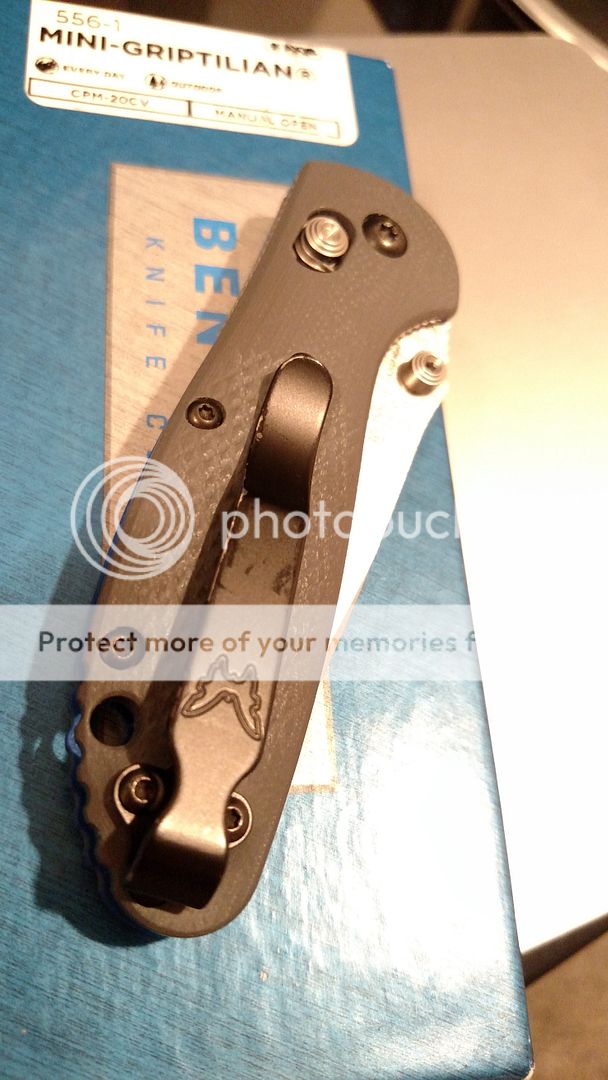 Up for sale is a new model benchmade mini griptilian 556-1. I'm torn about letting this one go, but the mini grip is just a little too small for me, so here it is. The G10 and the blue standoffs are a very welcome addition, as is the cpm20cv blade steel, which was run over the sharpmaker once to give it a hairpopping edge! The only issues are very fine brush scratches on the blade (both sides) which are seen in certain light, and some wear on the pocket clip, see pictures below and please PM me with questions. Action is great!