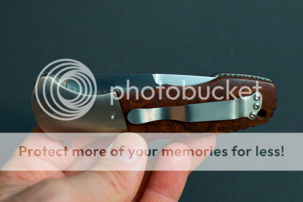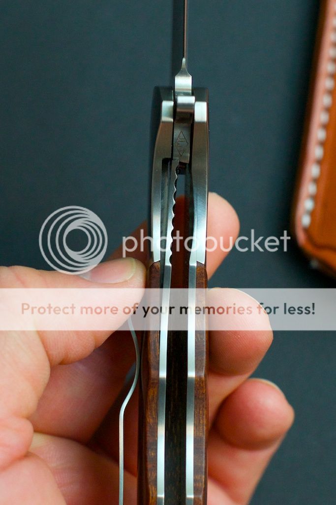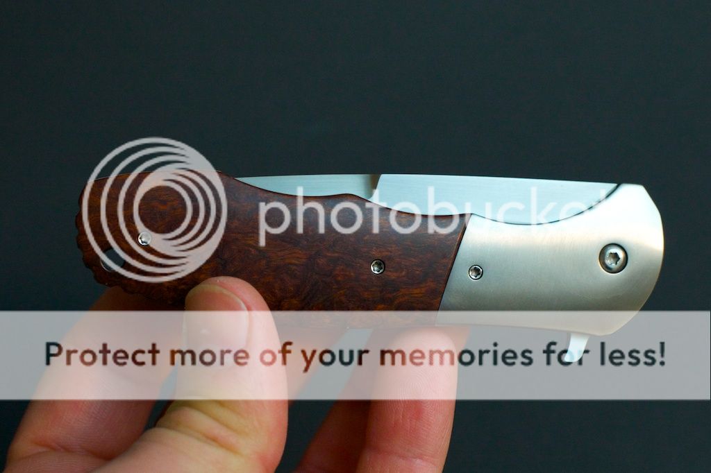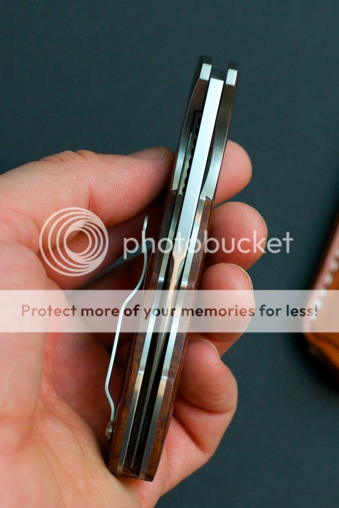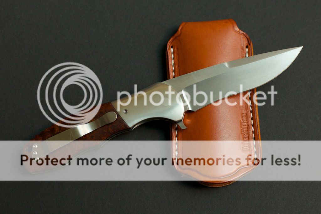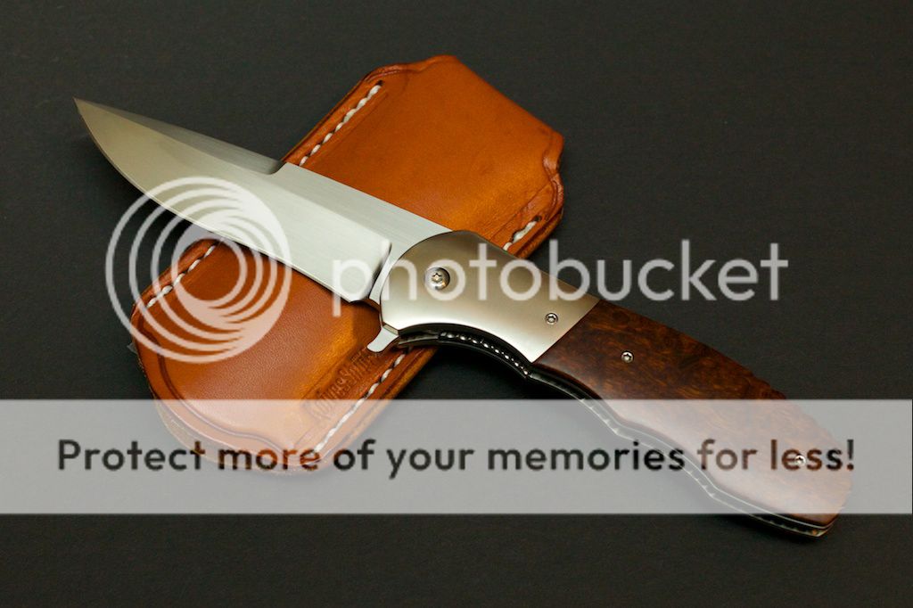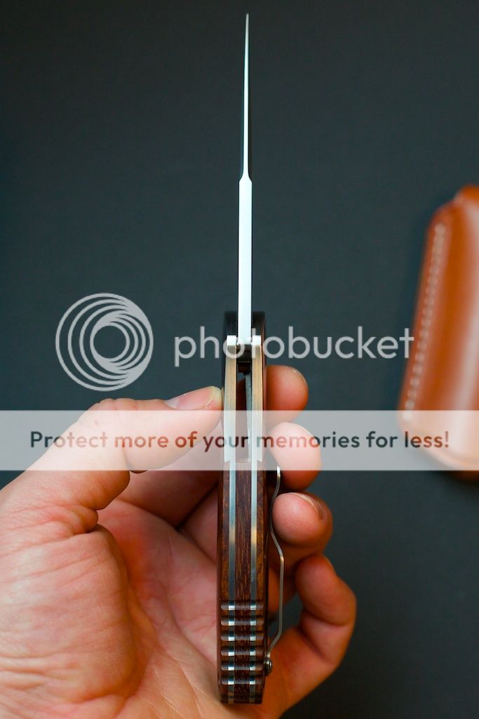 JW Smith F5 flipper - 4-inch hand rubbed CPM-154 blade with a nice recurve. Scales are ironwood with ti bolsters. Lock up is at 20 percent with perfect centering and no play in any direction. Barely carried but has a few light scratches on the ti bolsters and clip seems to happen as soon as you put it in your pocket. Blade hasn't cut anything yet. AWESOME flipper with no wrist action needed!!!! Asking $OLD which includes Priority Mail in USA with delivery confirmation and insurance. Comes with leather pouch.