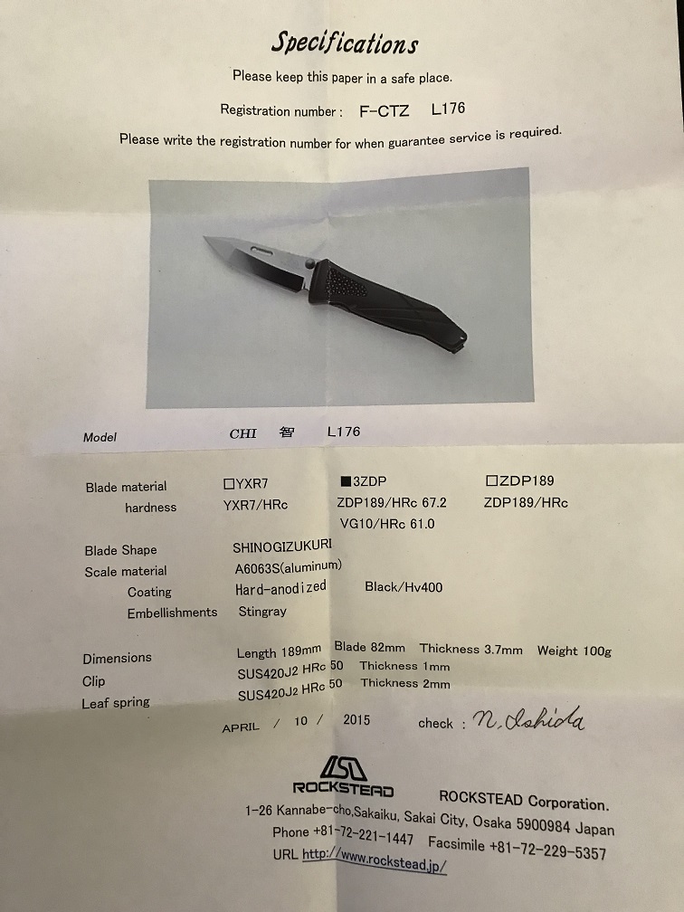 Rockstead Chi. Unused. Has not cut anything and has not been registered. As new. Comes with original box and paperwork. Perfect centering, early lockup. Glass smooth. No marks or scratches. MINT - US$790 NOW US$760 SOLD