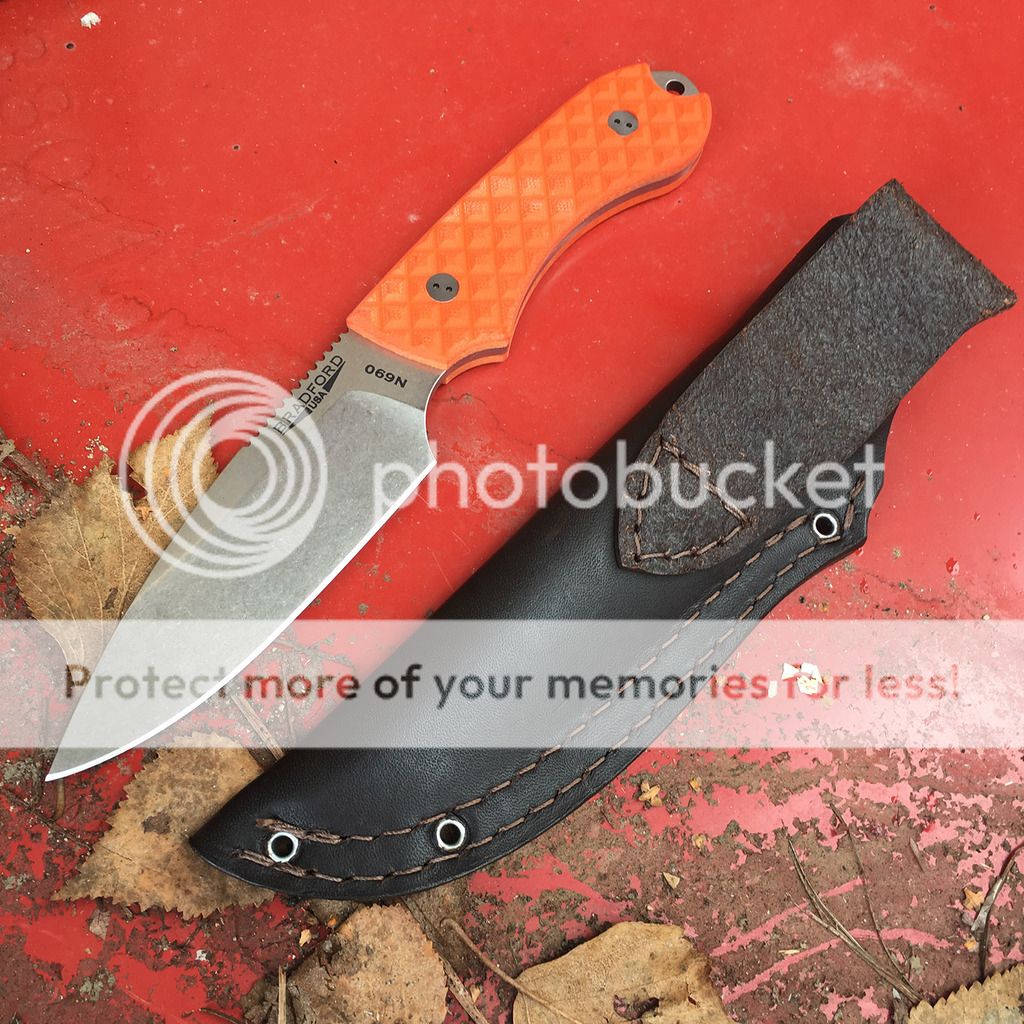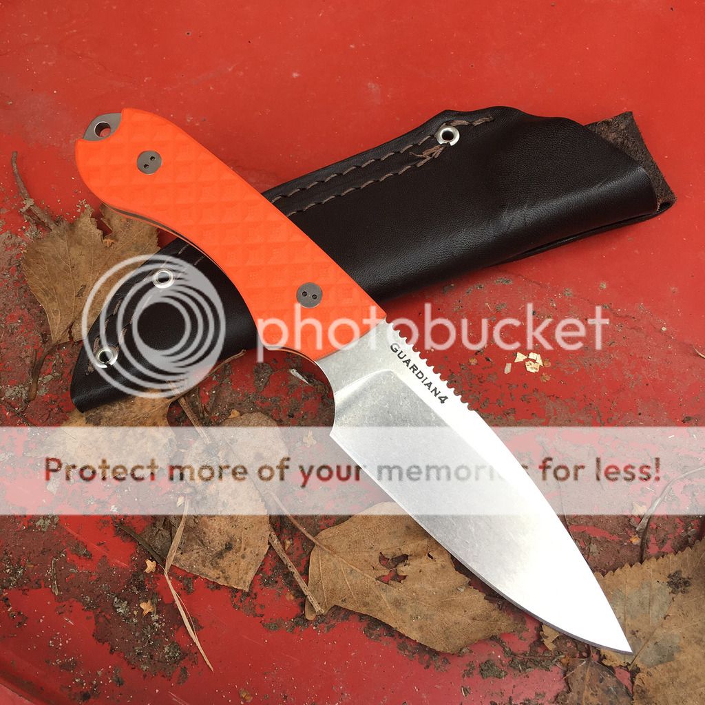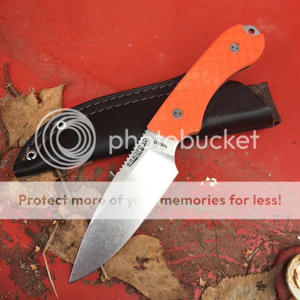 Here's a very nice Bradford Guardian 4 with razor-sharp N690 blade. I dont think Ive ever even used this one but I did carry it in my pack a couple of times. No marks on it but the orange g10 had a light patch on the side that you can Just wiped the whole knife down with a Tuf-Cloth and it looks fine now. Ive seen g10 look like that before after scrubbing a knife.