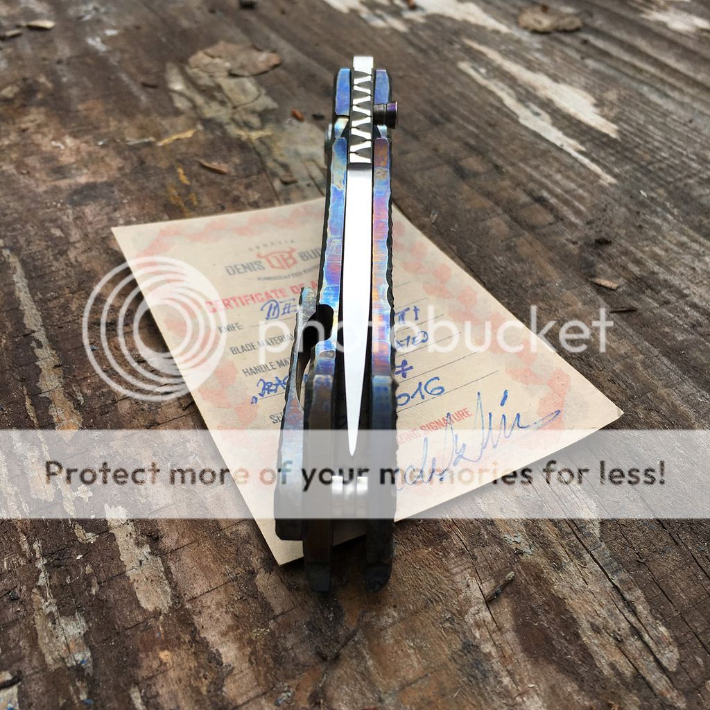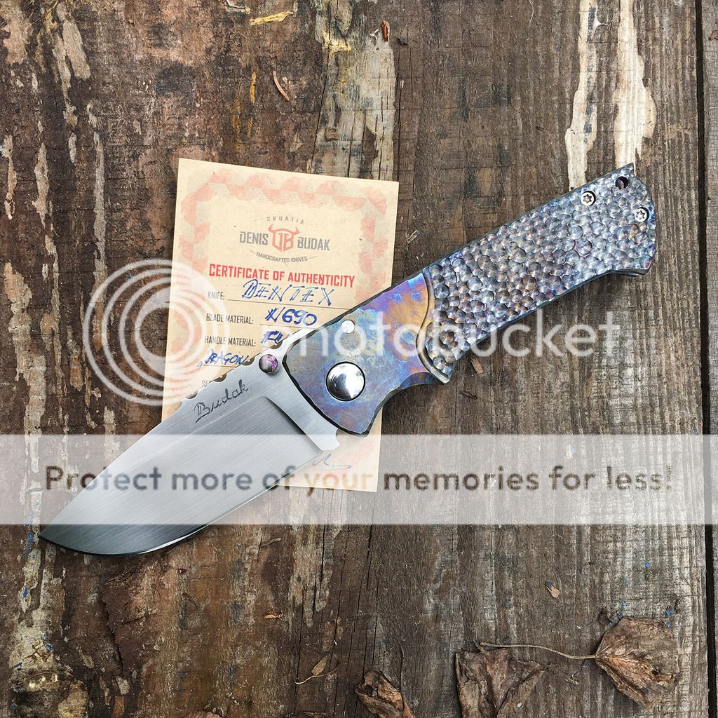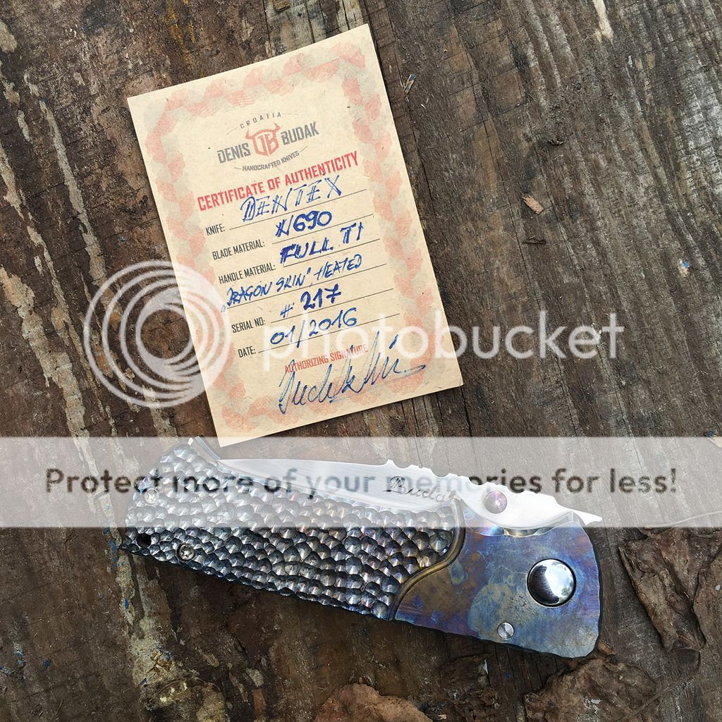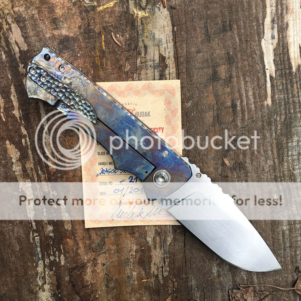 Up for grabs here is a beautiful Budak Dentex with multi-colored dragonscale ti frame and a beautiful hand-rubbed N690 blade with filework jimping. I am not the first owner and it looks like it may have been carried because of some very superficial scratches on the polished pivot. It's in excellent condition though. The action is just buttery smooth and lockup is rock solid. It is number 217 made January 2016 and comes with the certificate of authenticity and wool cloth from Denis.