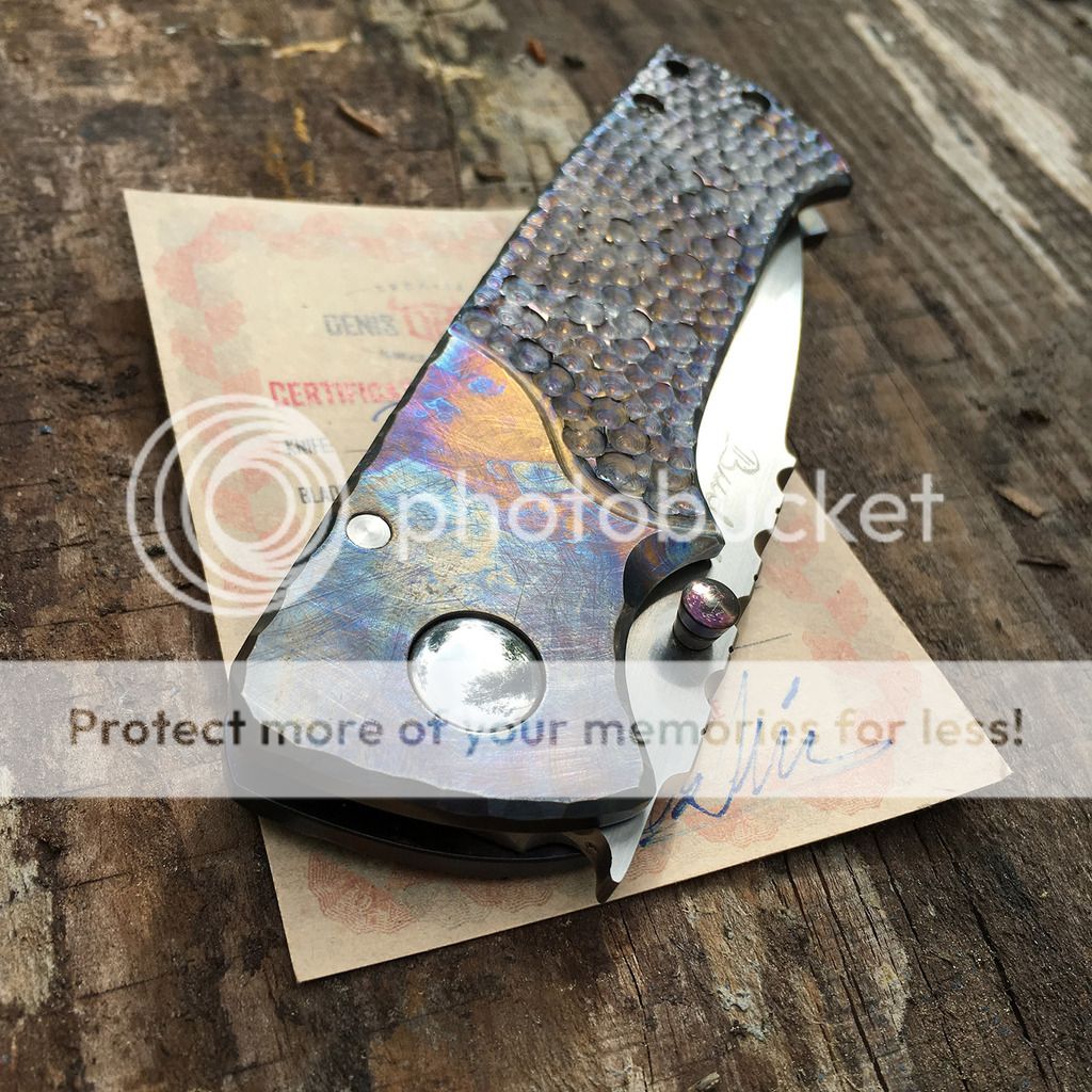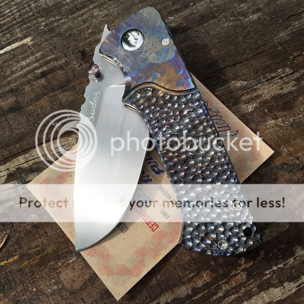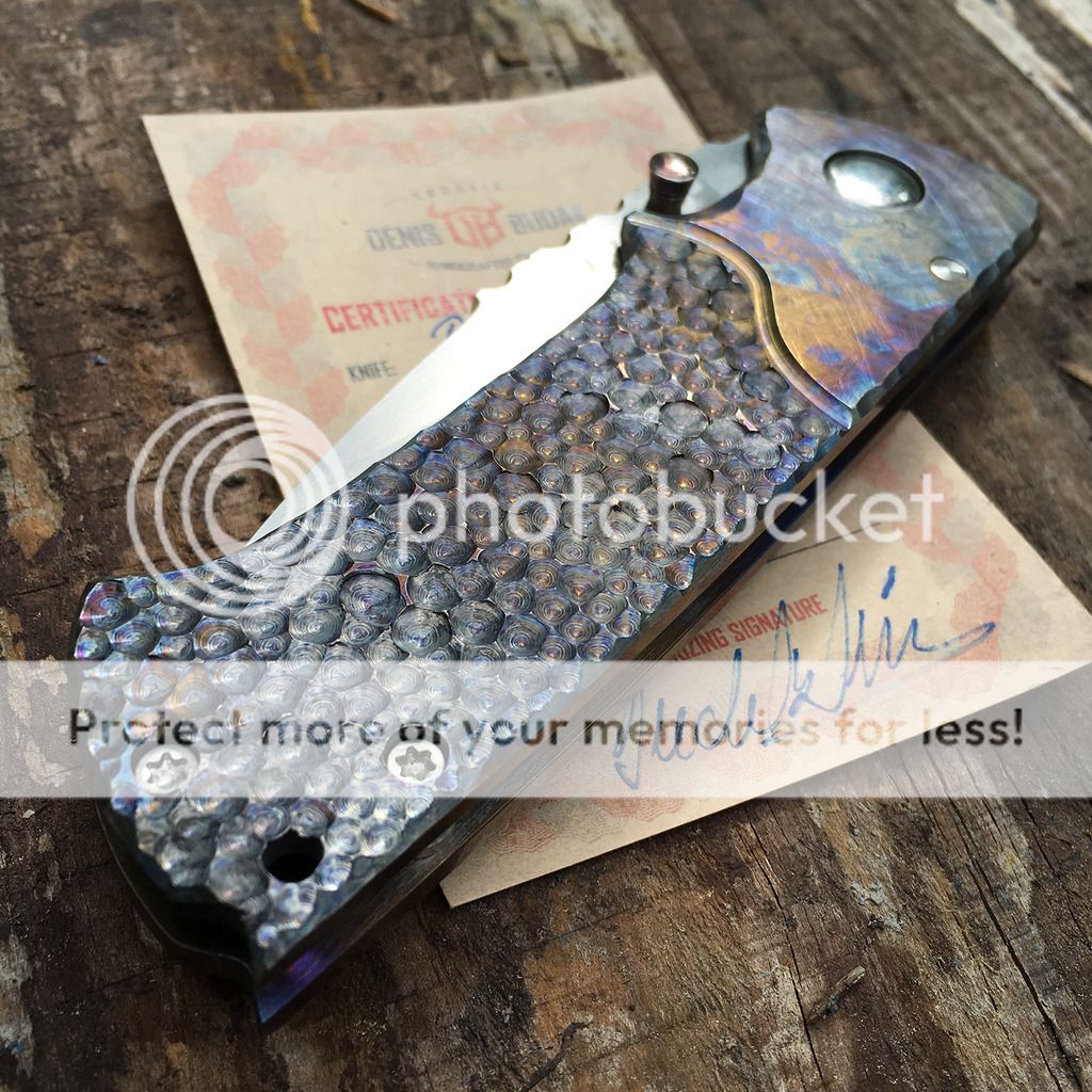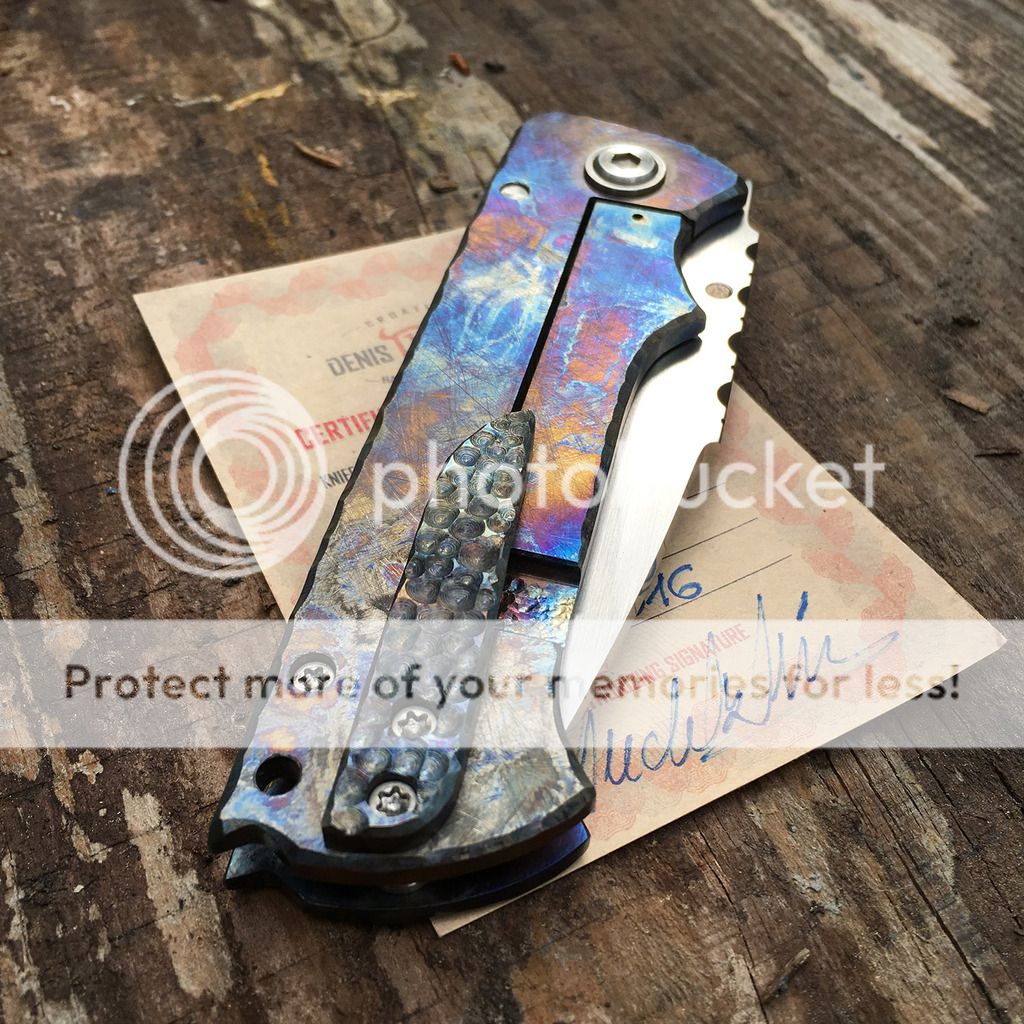 Up for grabs here is a beautiful Budak Dentex with multi-colored dragonscale ti frame and a beautiful hand-rubbed N690 blade with filework jimping. I am not the first owner and it looks like it may have been carried because of some very superficial scratches on the polished pivot. It's in excellent condition though. The action is just buttery smooth and lockup is rock solid. It is number 217 made January 2016 and comes with the certificate of authenticity and wool cloth from Denis.