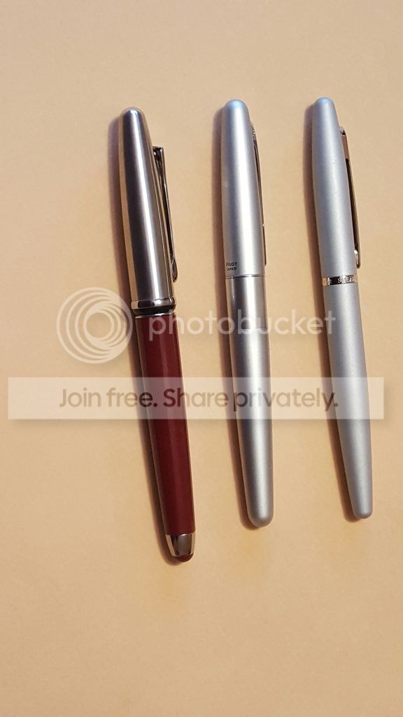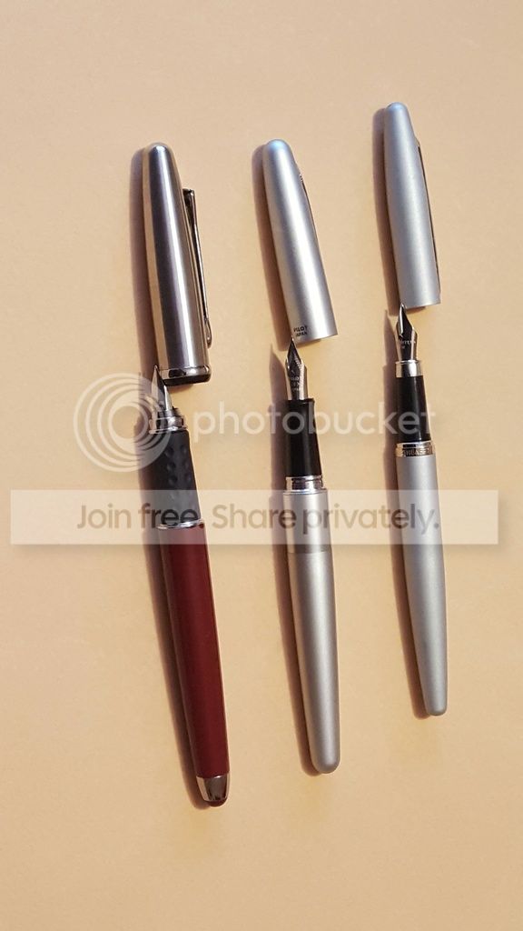 The package includes a Pilot Metropolitan with a fine nib, a Sheaffer VFM, and a Jaffa. The Pilot takes bottled ink and the other two take small cartridges. To get you started I will include a small tube of ink for the Pilot, which should be good for two or three fills, and six cartridges that will fit the other two pens.