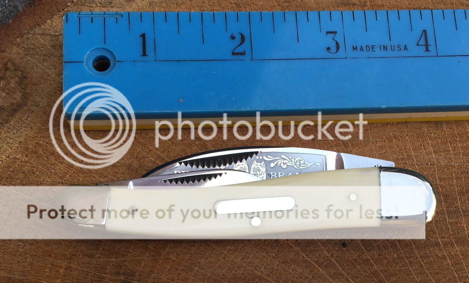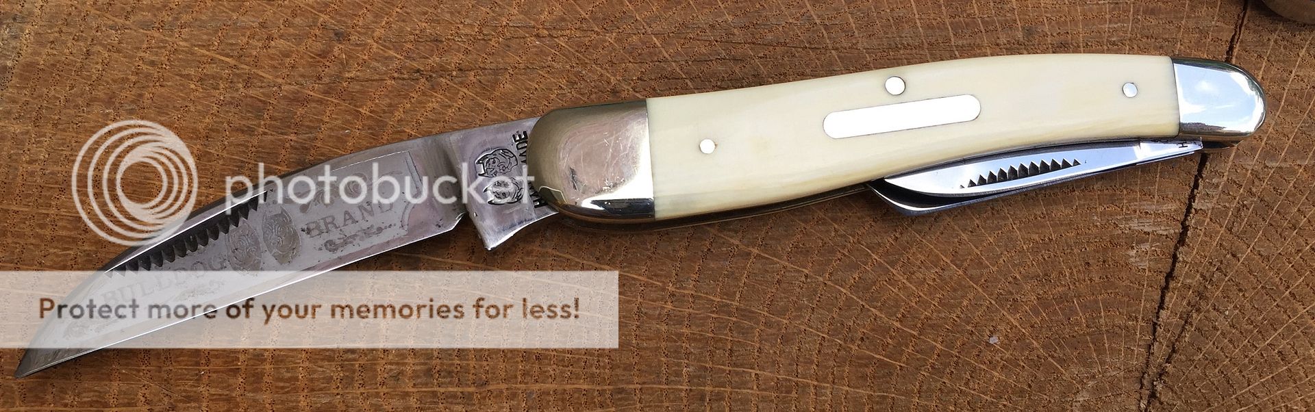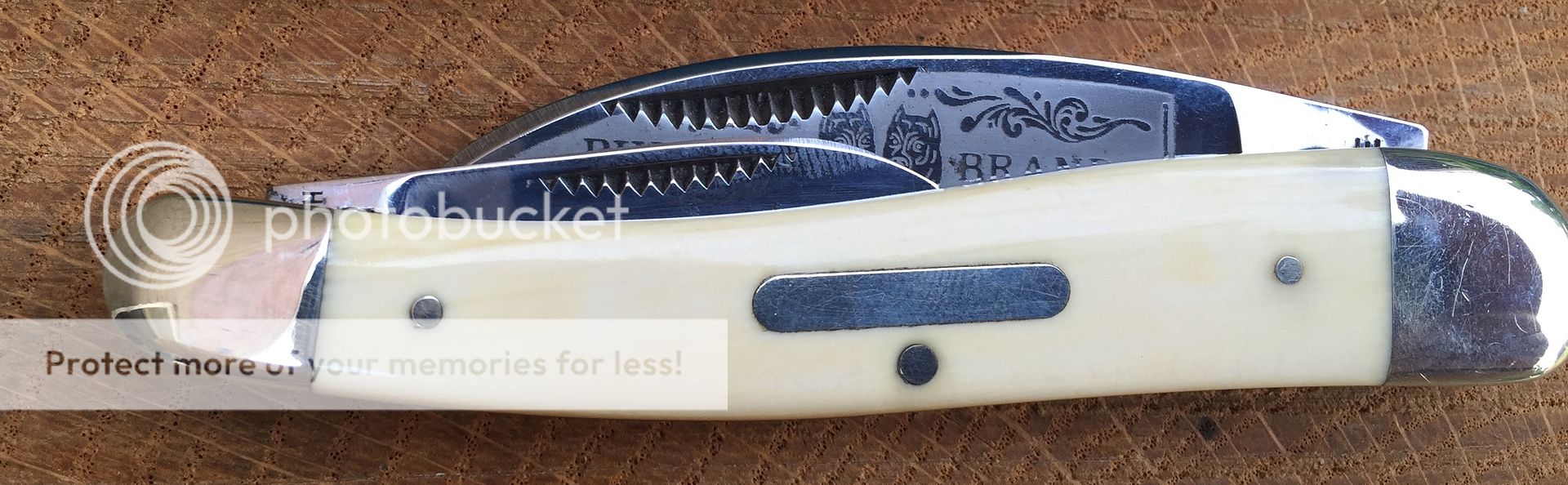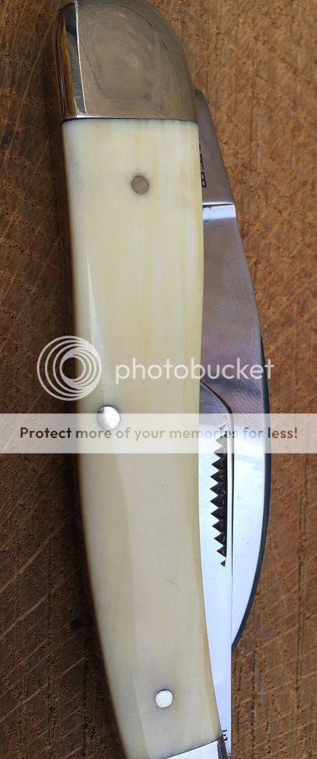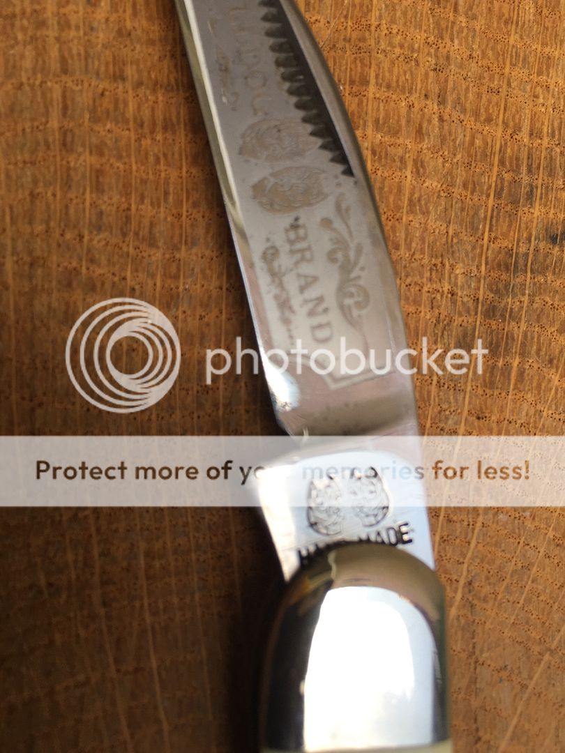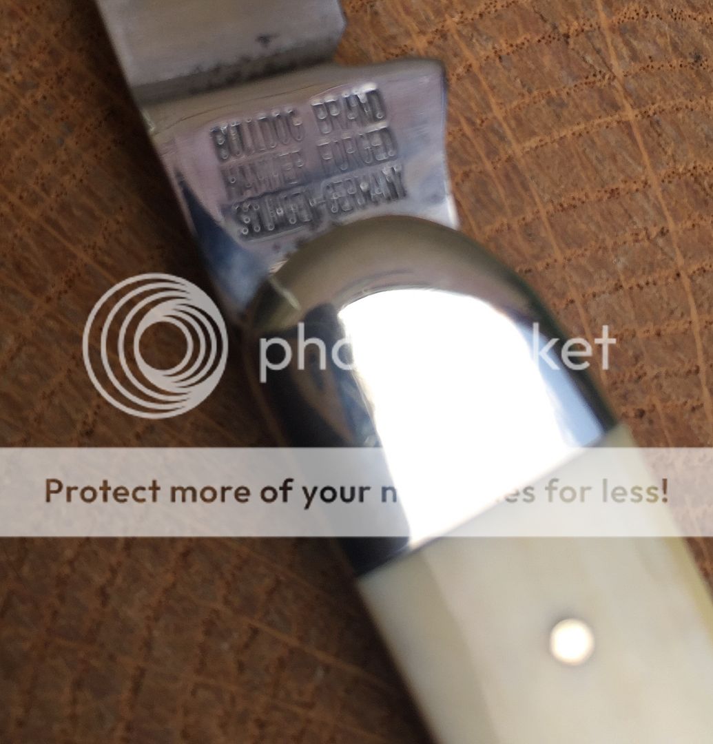 High polish carbon steel with fully intact etch. These are handmade in Germany. The knife shows some storage wear on the bolsters. Nothing major but expect to see some small imperfections. There are also pepper spots on the main and secondary blades. Mostly near the tang and ricasso. The knife has been like this since I received it. I've kept it oiled and it has not worsened. There is also minor blade rub as there is with all of this pattern. Nylon pouch included. Overall it's very nice looking knife with beautiful
