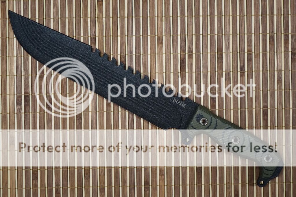 For sale is a brand new Busse Battle Saw with a black blade and green & black G10 scales. It has never been used, sharpened, or modified in any way. It's yours for SOLD shipped to the continental U.S., payable by USPS money order or PayPal (gift or add 3.5%). First "I'll take it" followed by a PM/email gets it. Thanks, but no trades are considered at this time.