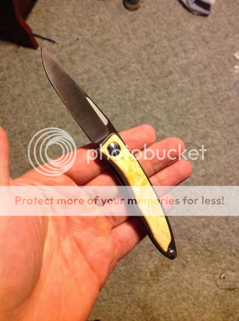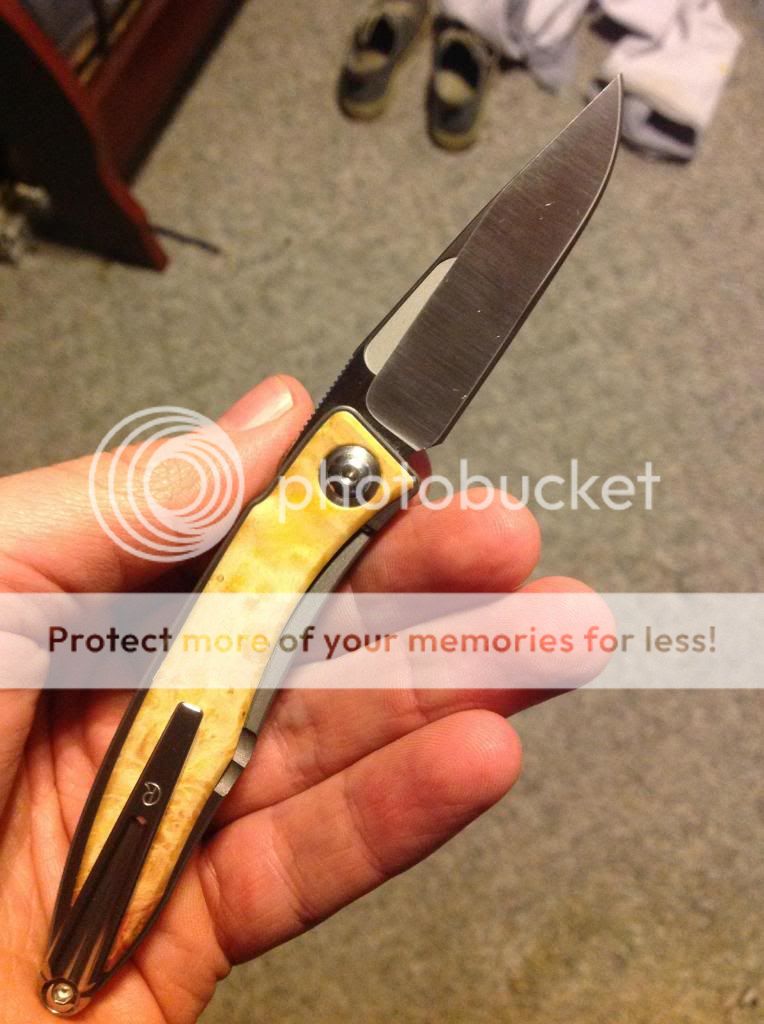 I bought this one recently and planned to keep it but bought a Hinderer the other day and can't keep both. It is a beautiful knife in a premium wood. It has a really nice pattern and coloration. Previous owner estimated that the knife is in 95% or newer condition and I absolutely agree. The specs on the blade are dust. Just trying to get my money back on this one. I'm asking $OLD and I pay the Paypal fees and shipping. Thanks