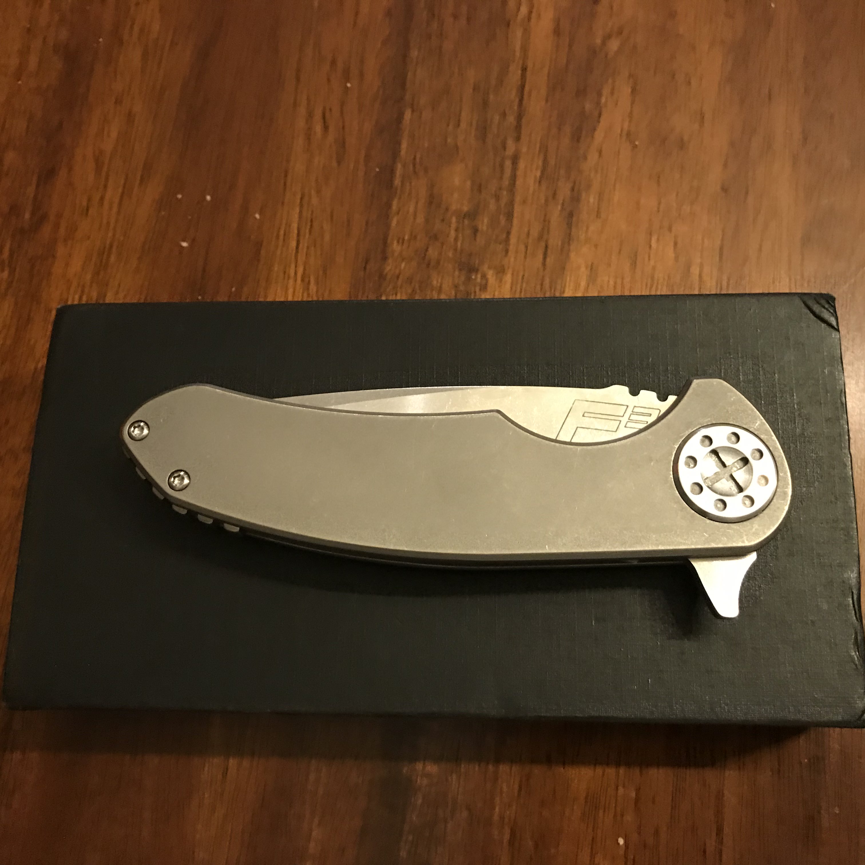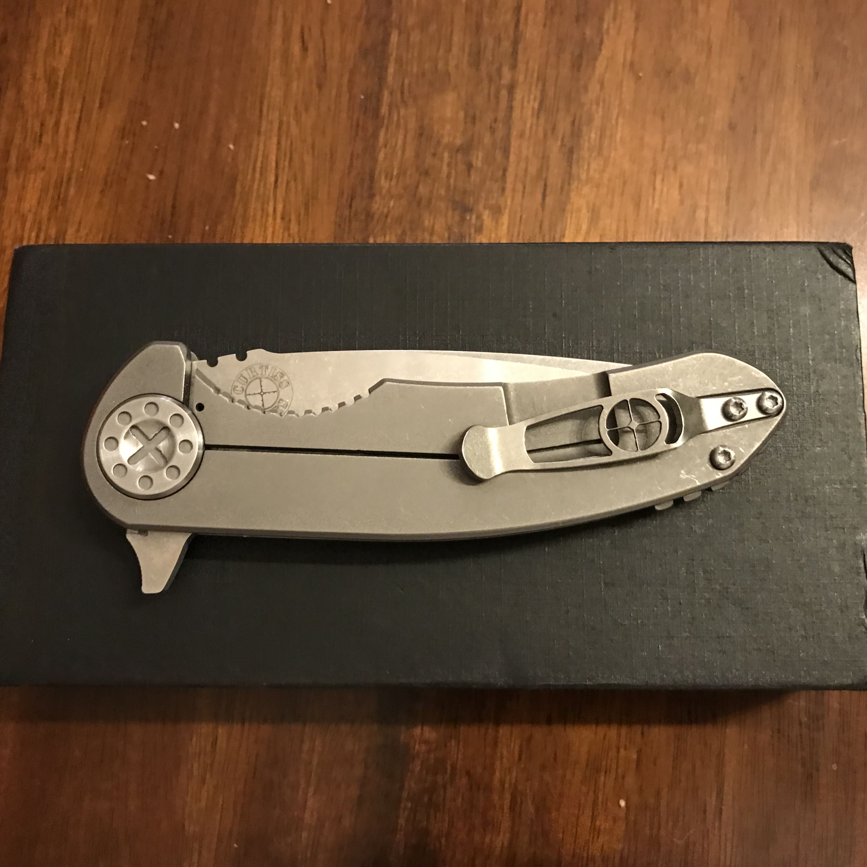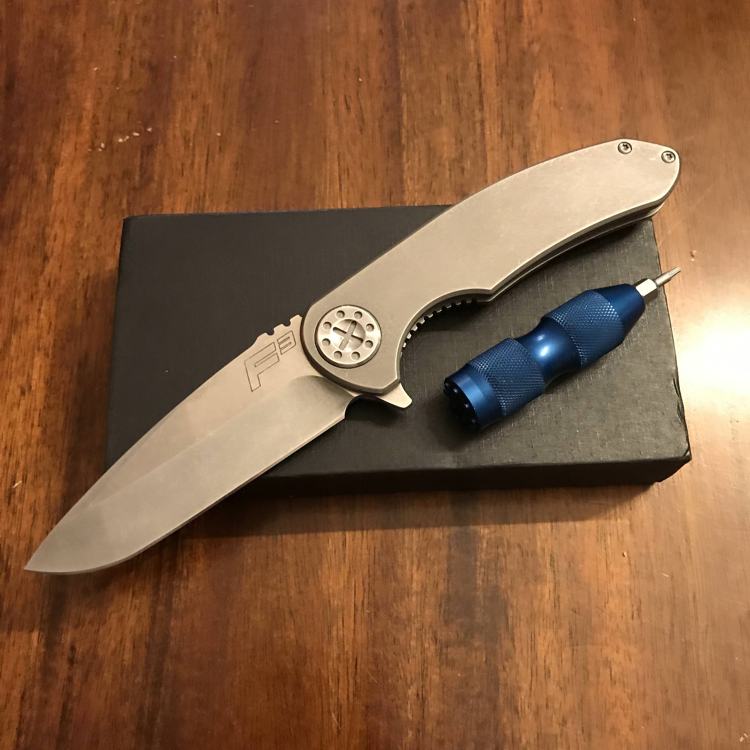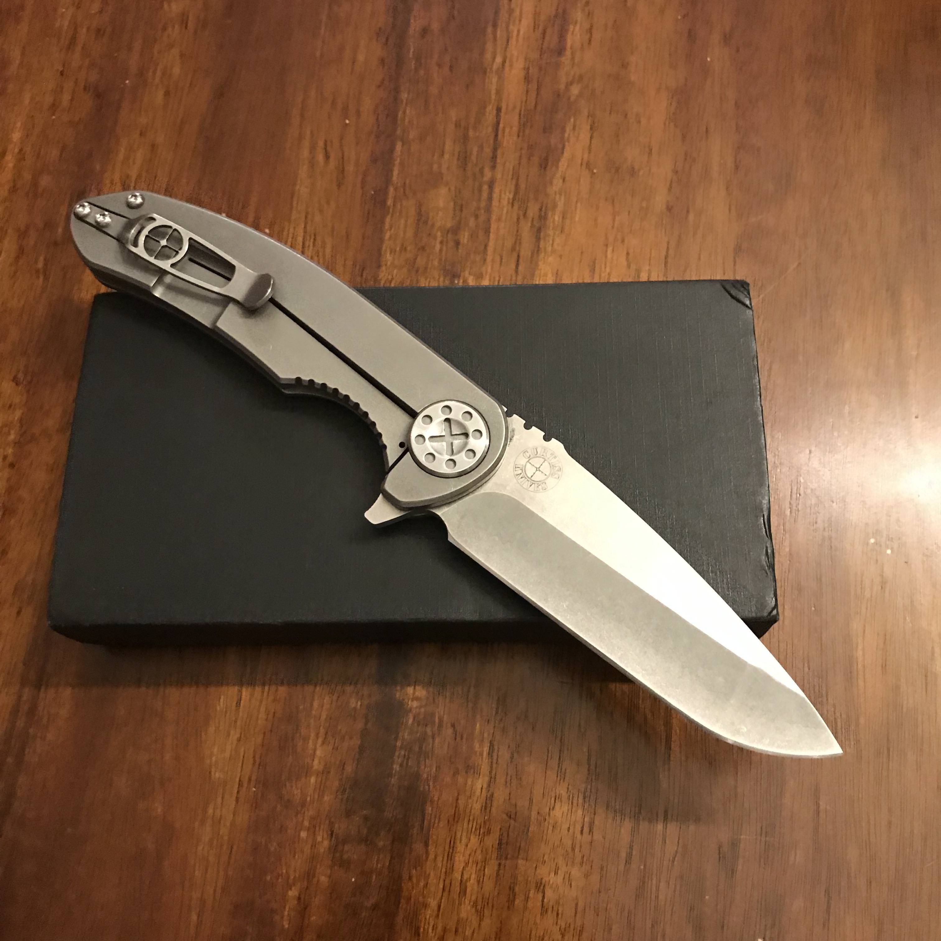 SOLD For sale is a large Curtiss F3. CTS-XHP blade steel. I received it described as brand new/unused, but appears to be lightly used to me. I have not used it and blade edge is in great shape, just a few snail trails. It just came back from Curtiss and he fixed a slight lock rock issue. It is now solid, blade is centered and action is typical Curtiss smooth. Comes with the Curtiss KME (knife maintenance tool) as pictured. Asking $395 and I’ll cover PayPal and insured priority shipping in the US. No trades.