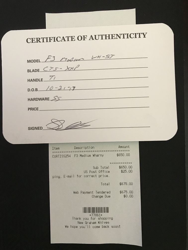 This is a medium sized F3 Wharny Grind Standard. This knife is the standard F-3 configuration. Features CTS-XHP for the blade. The frames are titanium.