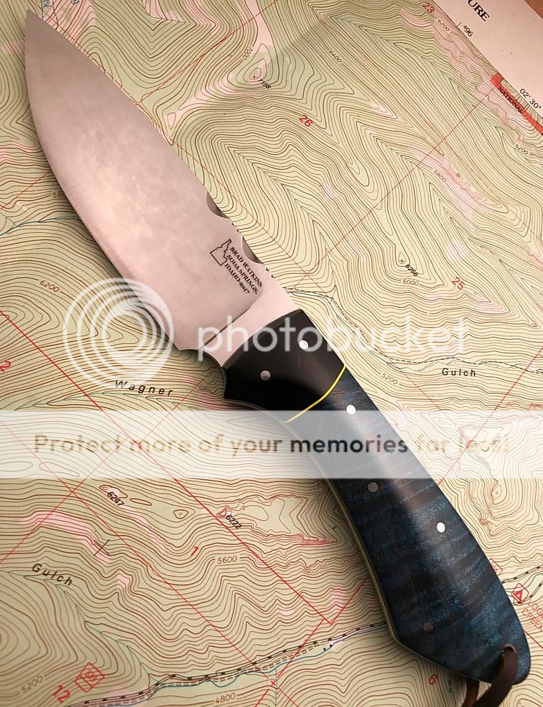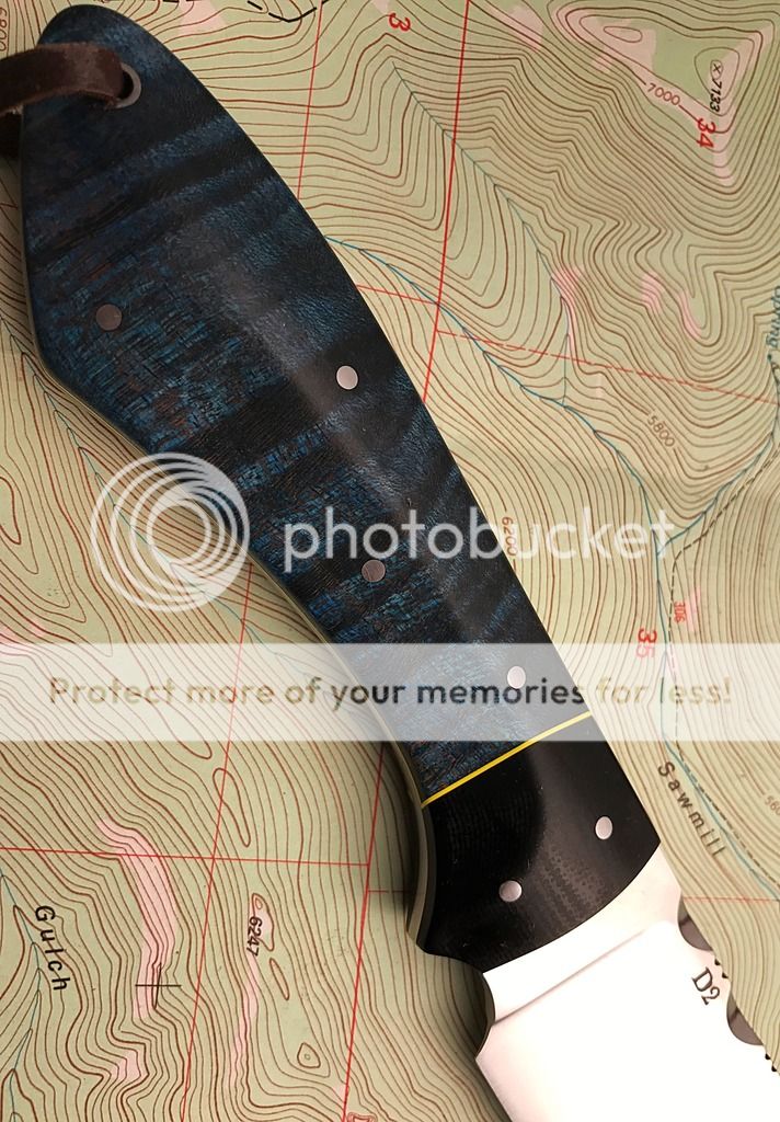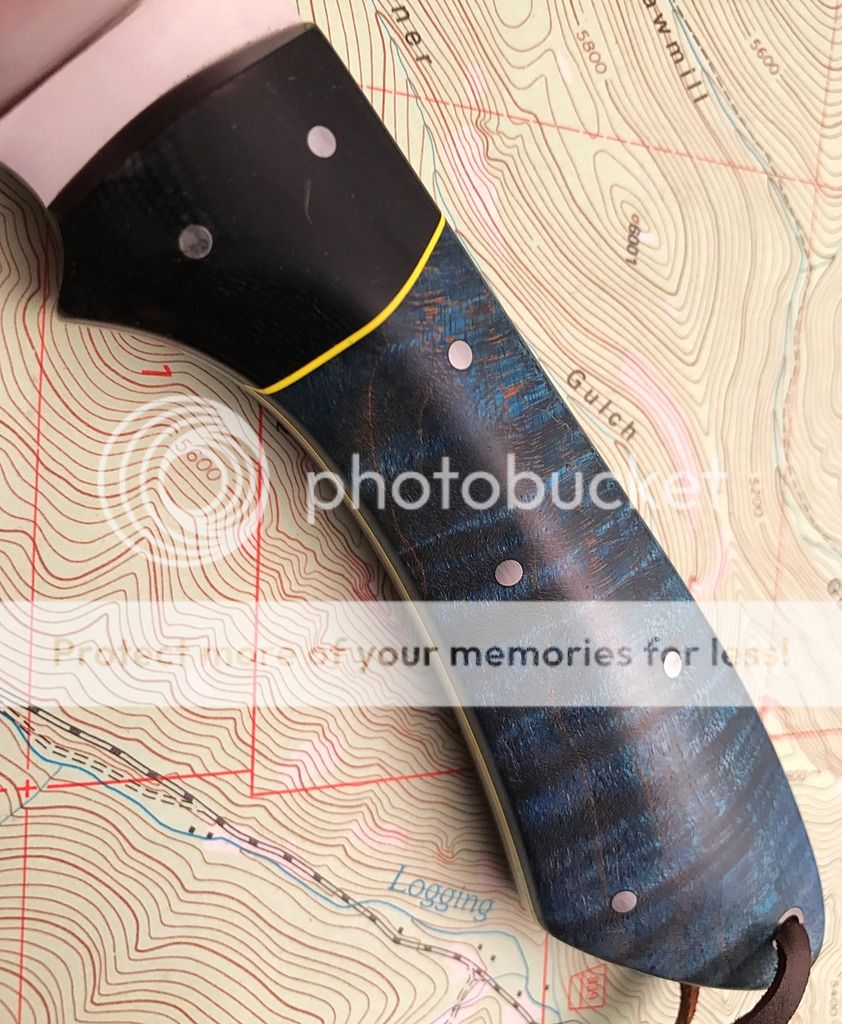 This is a great mid sized drop point with a beautiful piece of dyed curly maple. This picture doesn't do justice to the depth of this wood or the subtle orange accents!