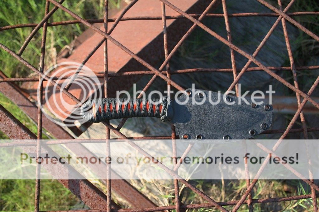 The steel is 5160, and the handle is two layers of paracord over a layer of leather, impregnated with West System marine epoxy to be rock solid and waterproof. The blade is 5", including the choil, and the overall length is 10 1/4". The spine is approximately 3/16" at the Turk's head knot, tapering distally to the point. It is, of course, shaving sharp.