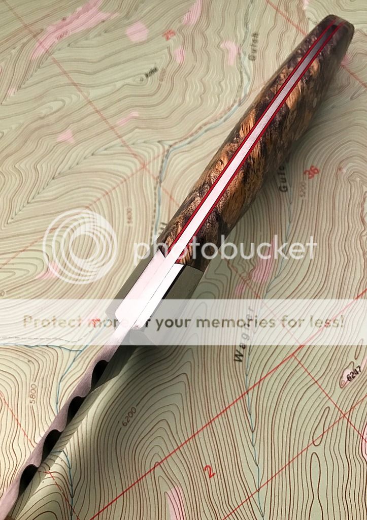Flat grind, 62 RC, tapered tang, file work on the spine, and acid etched