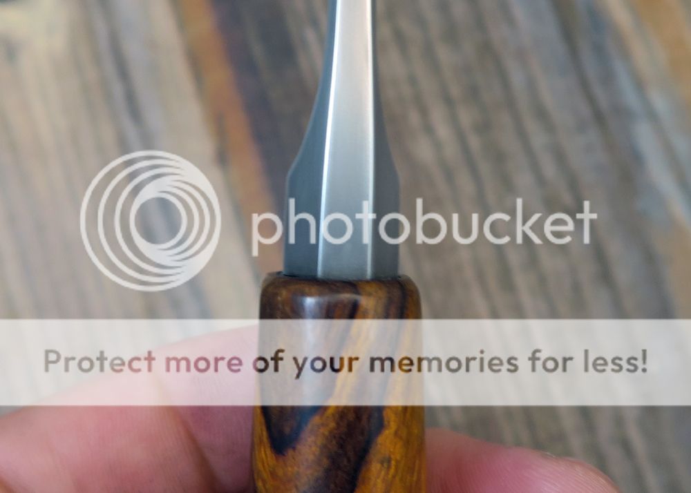 The handle is ironwood. It is polished and shaped to fit the hand well. The whole thing is held together with epoxy and a domed pin. The butt is rounded to and is very comfortable.