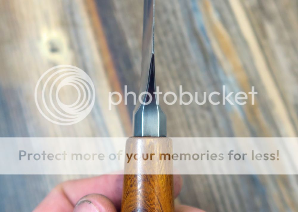 This one is forged from W2. I hand polished the blade to 1000 grit and then etched to bring out the hamon. I am quite proud of the faceting I did on the integral portion of it. I think it is my best work yet.