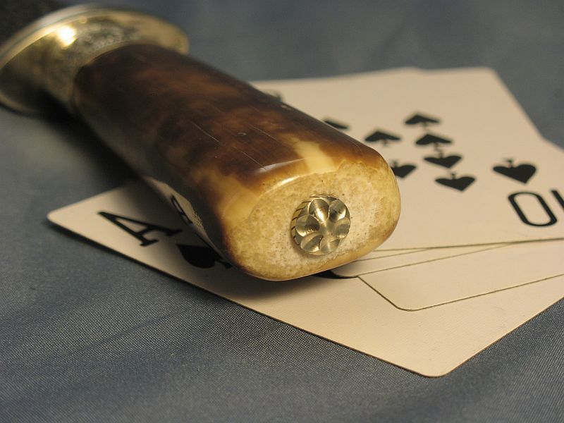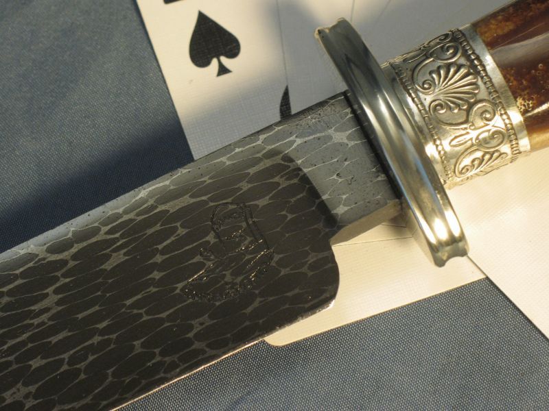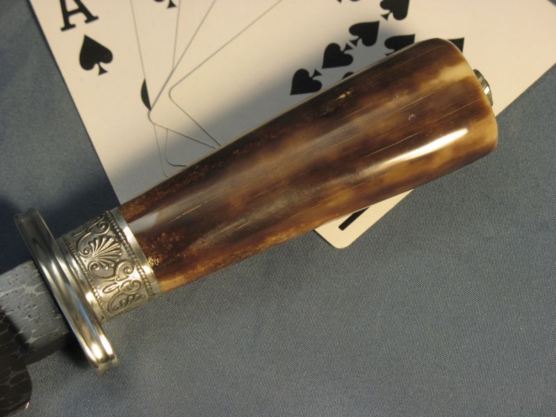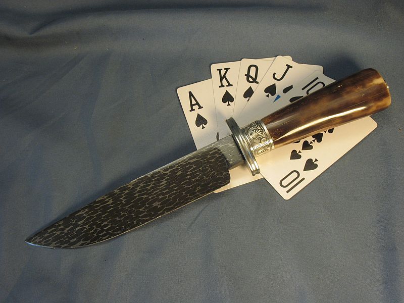 This knife I think is a Gamblers Bowie or could be used as a skinner? At least I think? The handle is fossil Walrus from private native lands that was washed up on the beach and used by an Eskimo as some sort of tool. it was found and collected by an Eskimo of today who sold it to my supplier. Blade length is 6 3/8 inches and overall the knife is 10 7/8 and 1/4 inch thick at guard. Sterling ferrule and nickel silver fittings with my Snakeskin Damascus made with 52100 steel ball bearings and 4800 KC steel. It is razor sharp and a wicked point. The handle is solid and out of the ground for 18 months. More pictures upon request. This one is "SOLD" plus 12.00 priority mail. My paypal and e-mail is dangraves4923@earthlink.net Thanks.