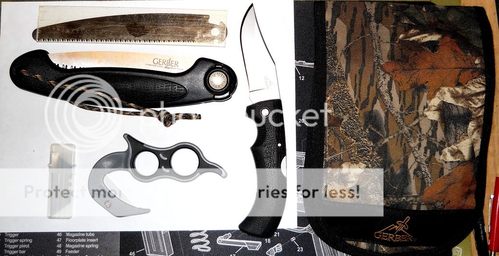 Gator Clip Point Folding Knife, E-Z Zip gut hook with replacement blades, Exchange-A-Blade saw with two blades, Mossy Oak Break-Up Sheath. Like new condition and the Gator knife is razor sharp.