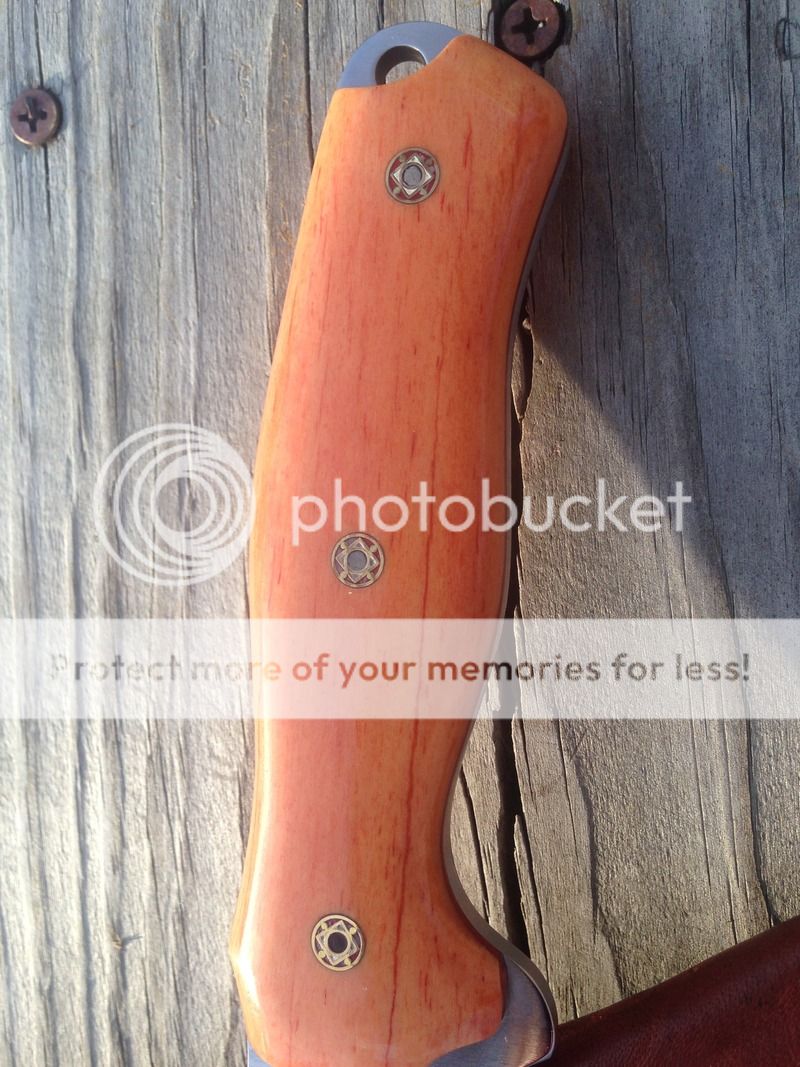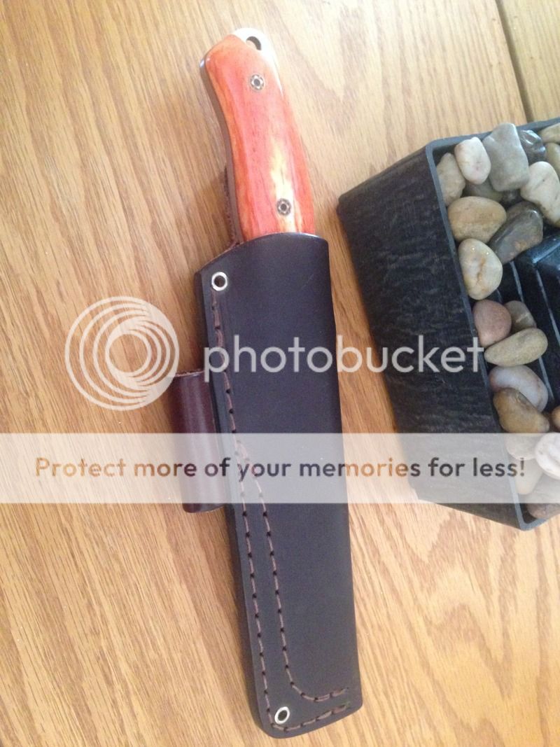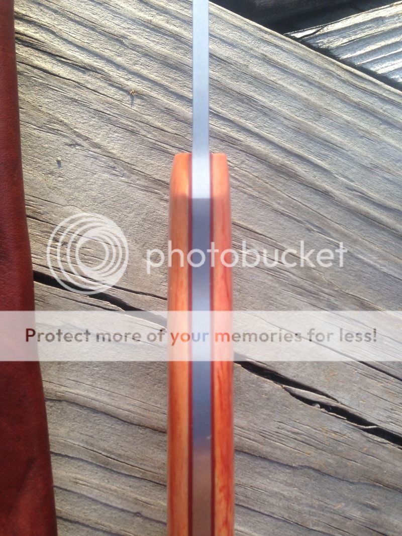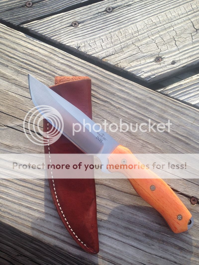 New unused from Blade Show. I have only wiped it down with Flitz a time or two. It does have a tiny shiny spot on the very edge. Came that way,think it is just how the light catches it.With the Custom Shop closed it may be a good while before any more pieces like this show up. Infimandu with Giraffe bone,super sharp convexed edge. Comes with Leather sheath.