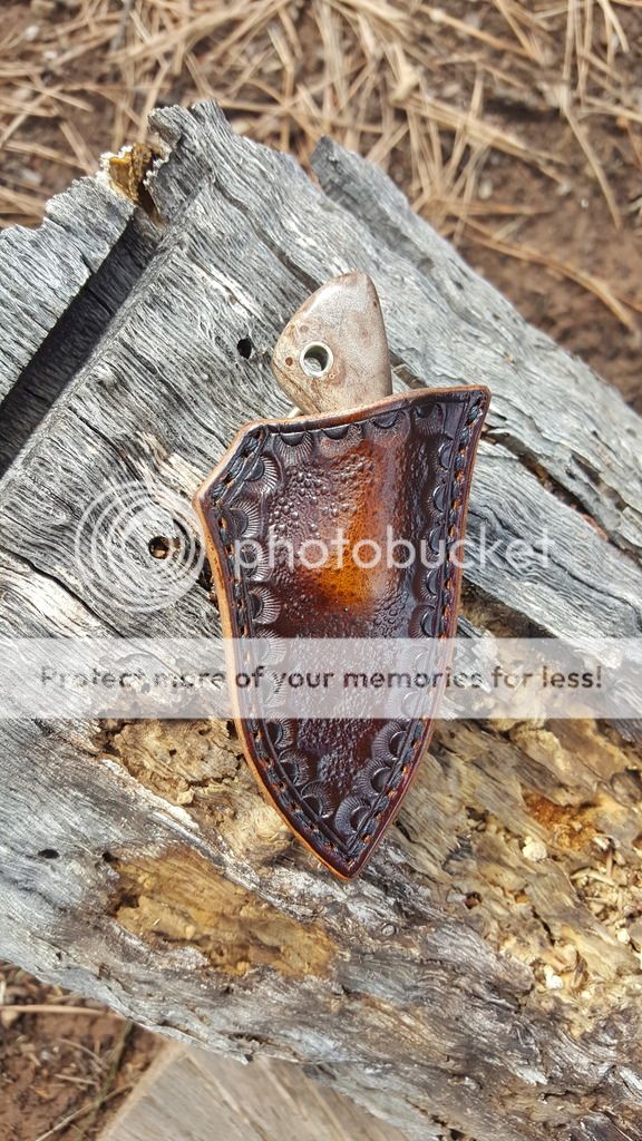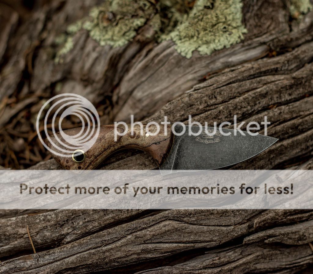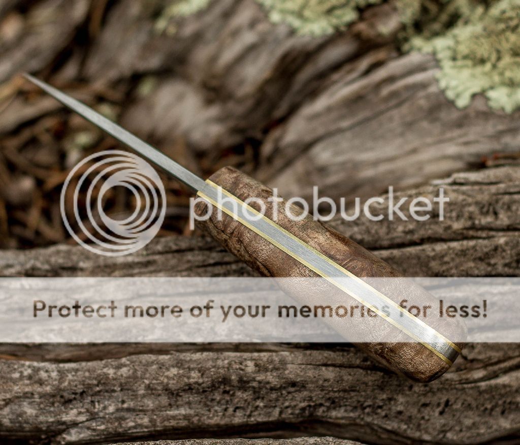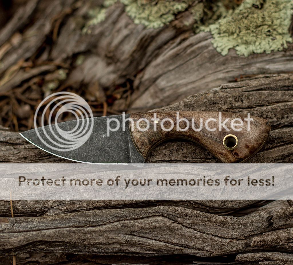 I have an Inya model up for sale today. This one has an acid etched/stonewashed 1095 blade with stabilized spalted maple burl scales over brass liners. The sheath is set up for pocket carry and has a D-ring on the back for a pocket watch style chain/lanyard.