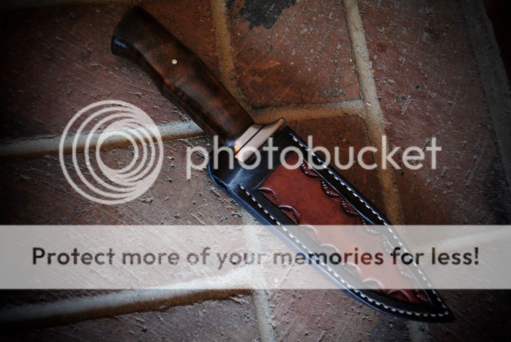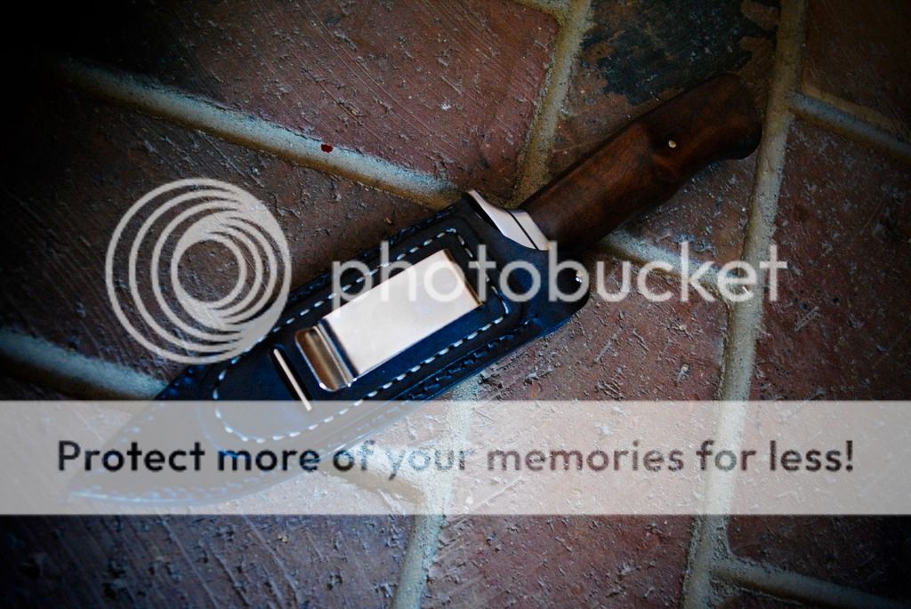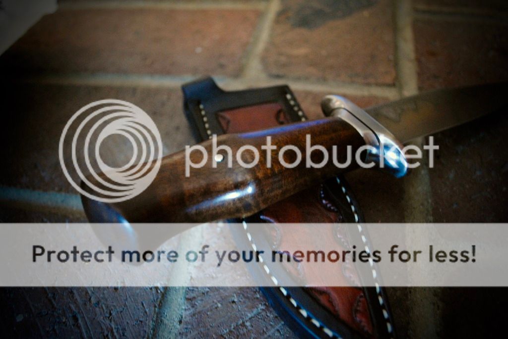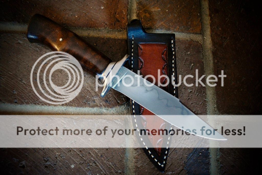 A slim bladed fighter with a ergonomic walnut handle and stainless guard. A right handed leather sheath with a belt/boot clip is included.