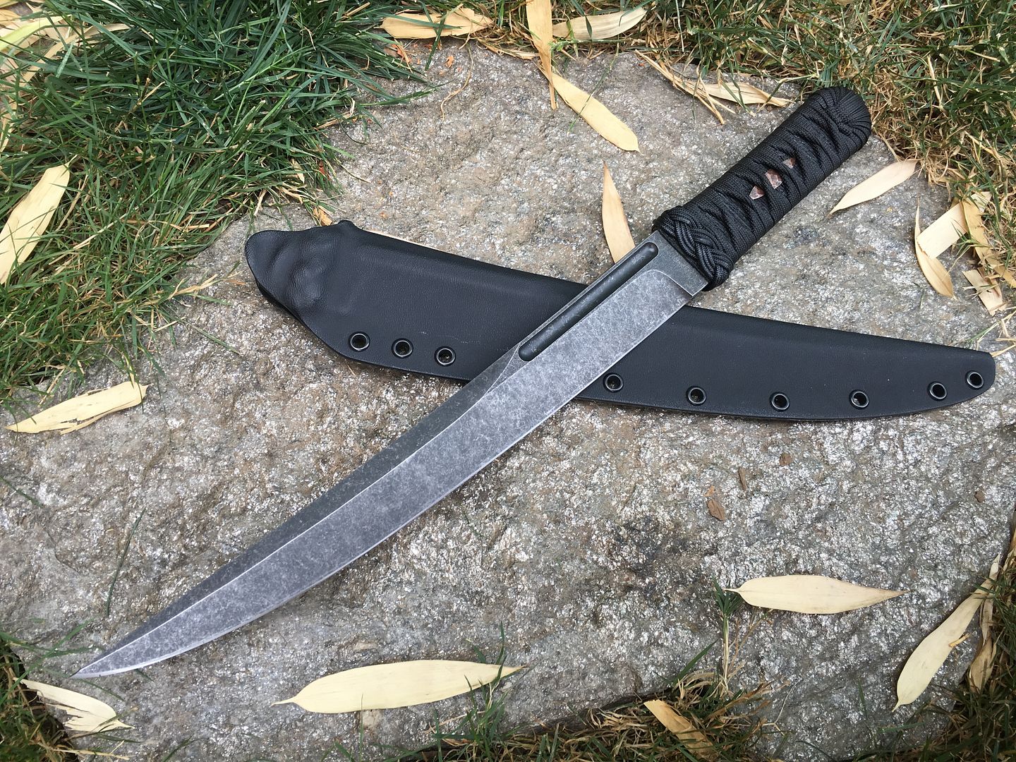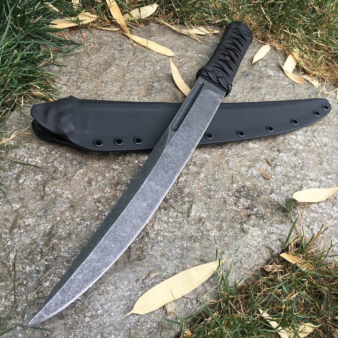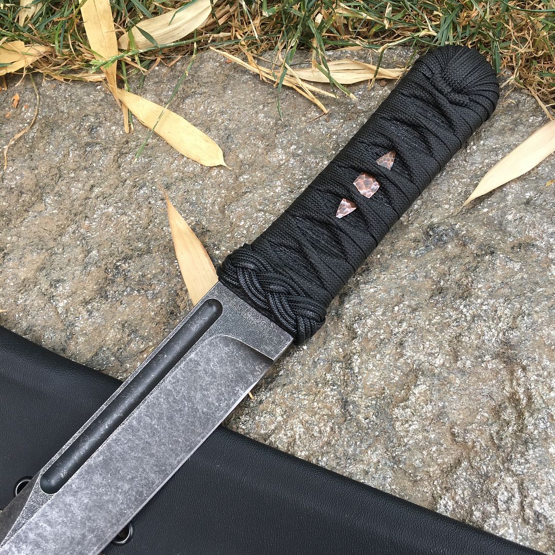 This one has a dark acid wash finish and copper menuki. The handle is hardened with West systems marine grade epoxy and is very durable.