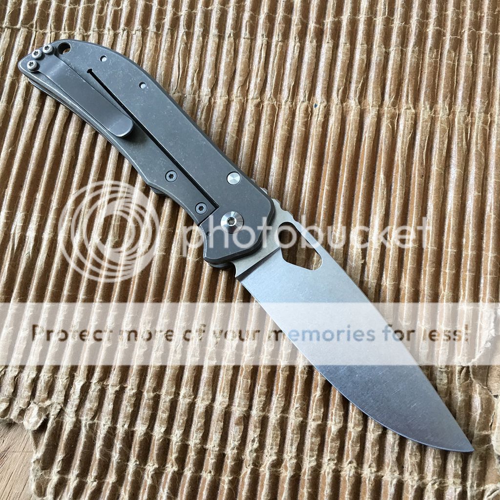 Here's a barely used Large Gen 3 El Patron non-flipper with CTS-XHP blade, bearings and lock bar insert. I'm letting a few go because of other purchases I've made. This one is definitely a favorite of mine. The blade is pristine but I see some light marks on the clip and very light marks on either end of the frame. The frame finish doesn't get marked easily. Blade is centered and has no play in any direction. Lockup is rock solid. It has a really dark bronze finish on the frame. Haven't seen any other Gen 3 Large non-flippers for sale. Not desperate to sell and am pretty firm on price. Clear plastic tube with red caps included.