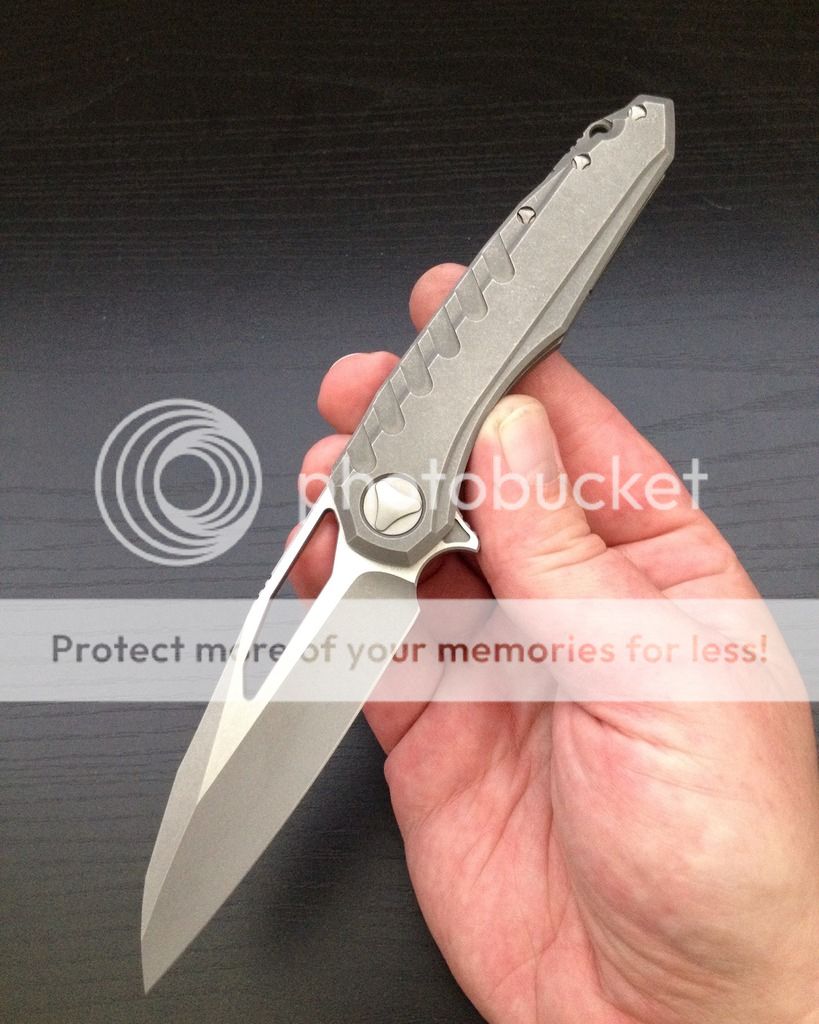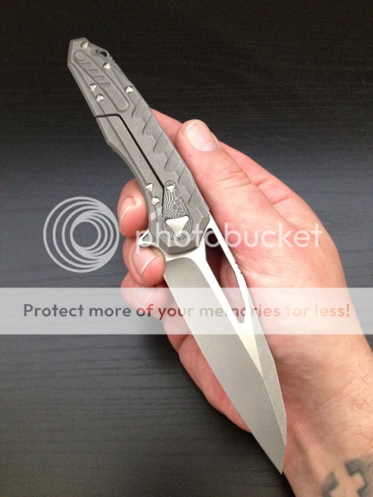 two-tone satin/apocalyptic elmax blade, milled full apocalyptic titanium scales, spring pocket clip,