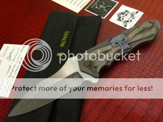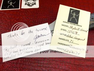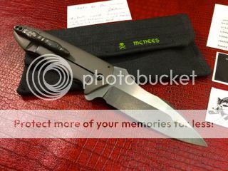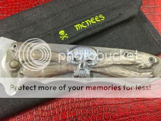 After acquiring this awesome flipper at the recent G6 in Las Vegas, it's time to let someone else enjoy this "One Of A Kind". That's right, this one is a One Off! It's action is superb and is centered as you can see. Never carried it or ever cut anything with it except a sheet of paper. The Knife material can be seen below in the photo's that I just took of the McNees Flipper. Comes with everything you see in the photo's. Two cards with materials filled out by Jonathan McNees, custom pouch made by Jonathan's wife and two McNees stickers. You can also see this knife in action on my YouTube Channel along with many knife video's I have made. -->https://www.youtube.com/user/tommybes61/featured?view_as=public