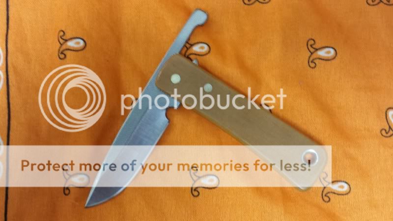""Friction Folder" History tells us the ancient Romans were the first ones to make a folding knife, it was a 'Friction' style. Here's my version... Made from an American made file tempered down to around 58rc., cutting edge is from 1 3/4" to 2 1/4" (actual tip to handle is about 1/4" longer than cutting edge). NickelSilver pins, Black Micarta spacer. Handles are all made of Micarta, Colors are Black, Brown, OliveGreen, and Natural (like burnt orange)."