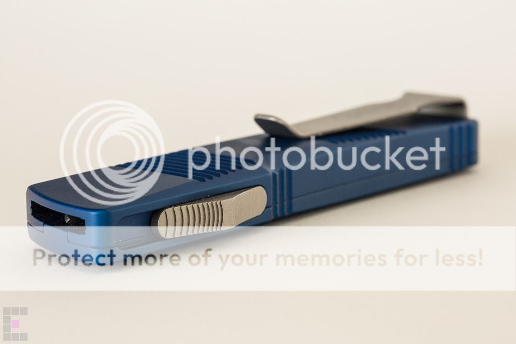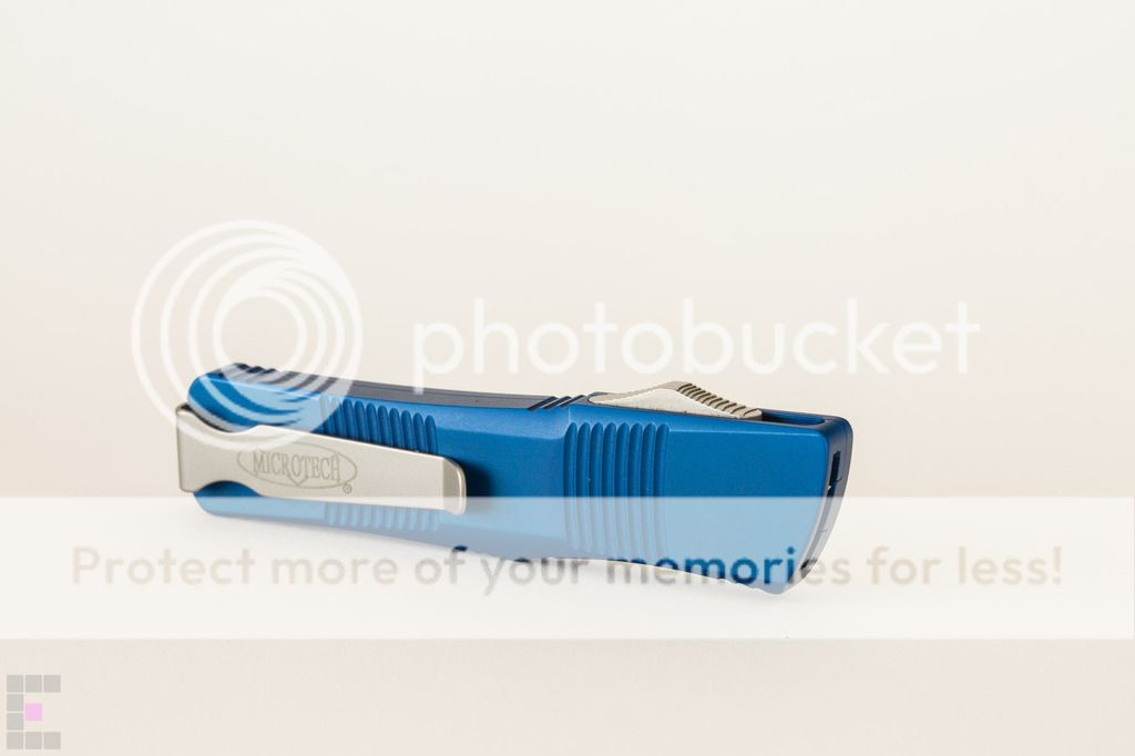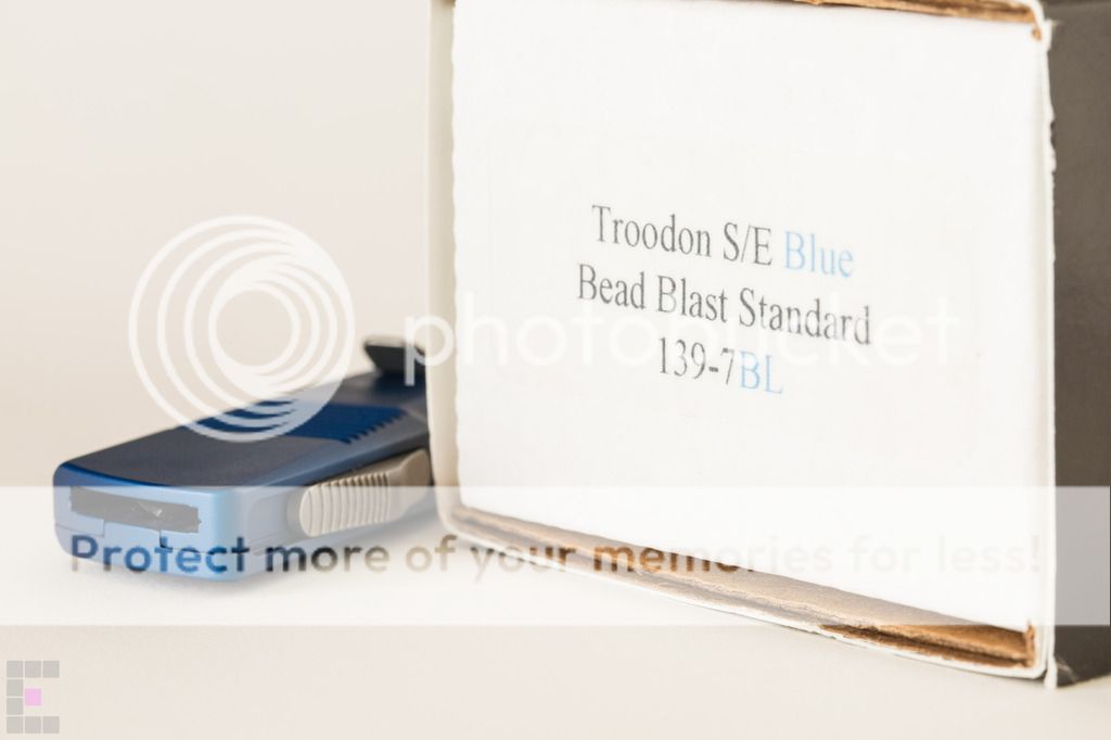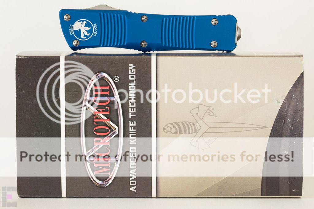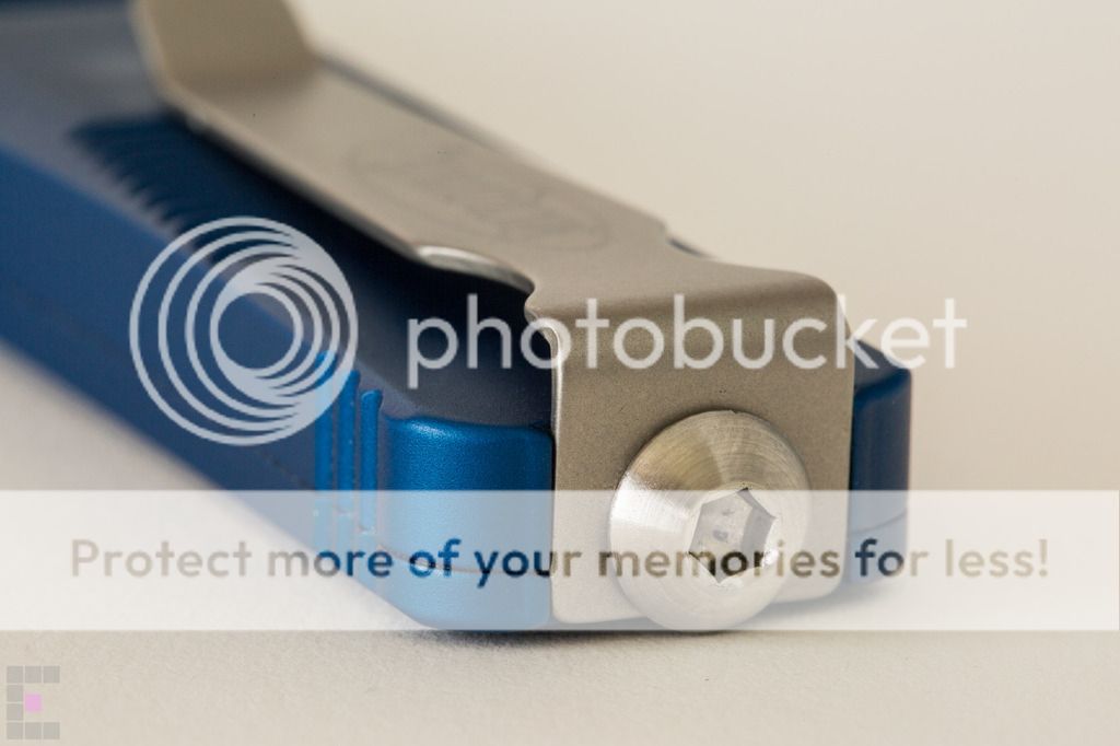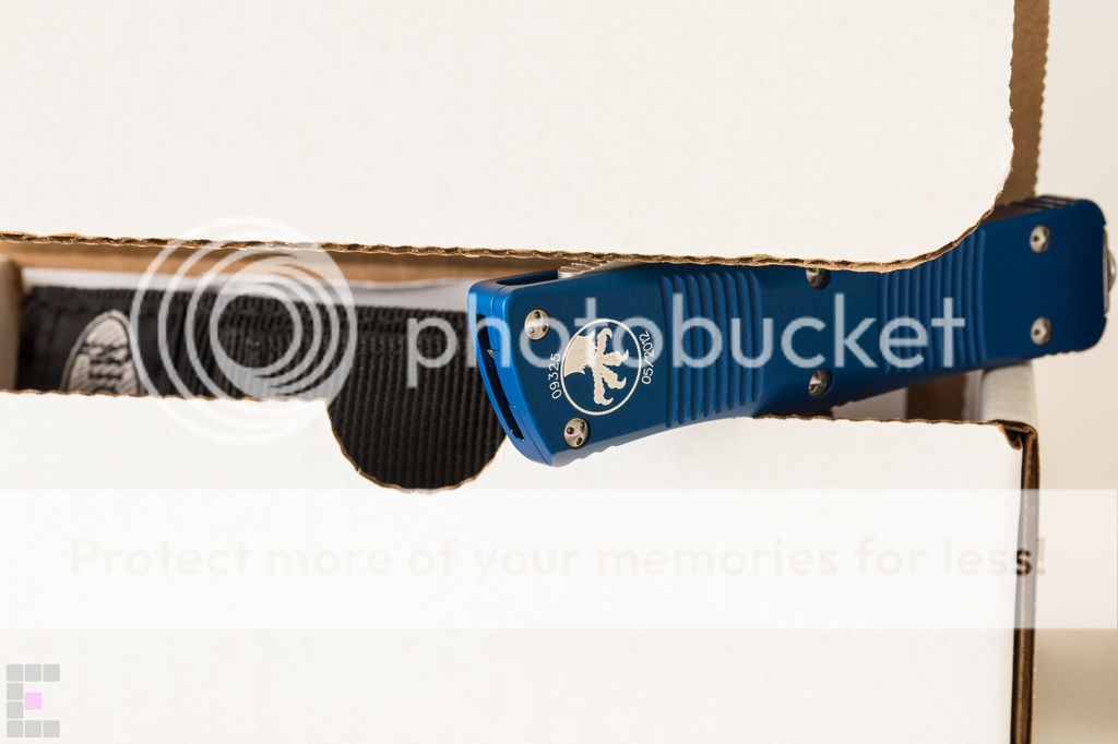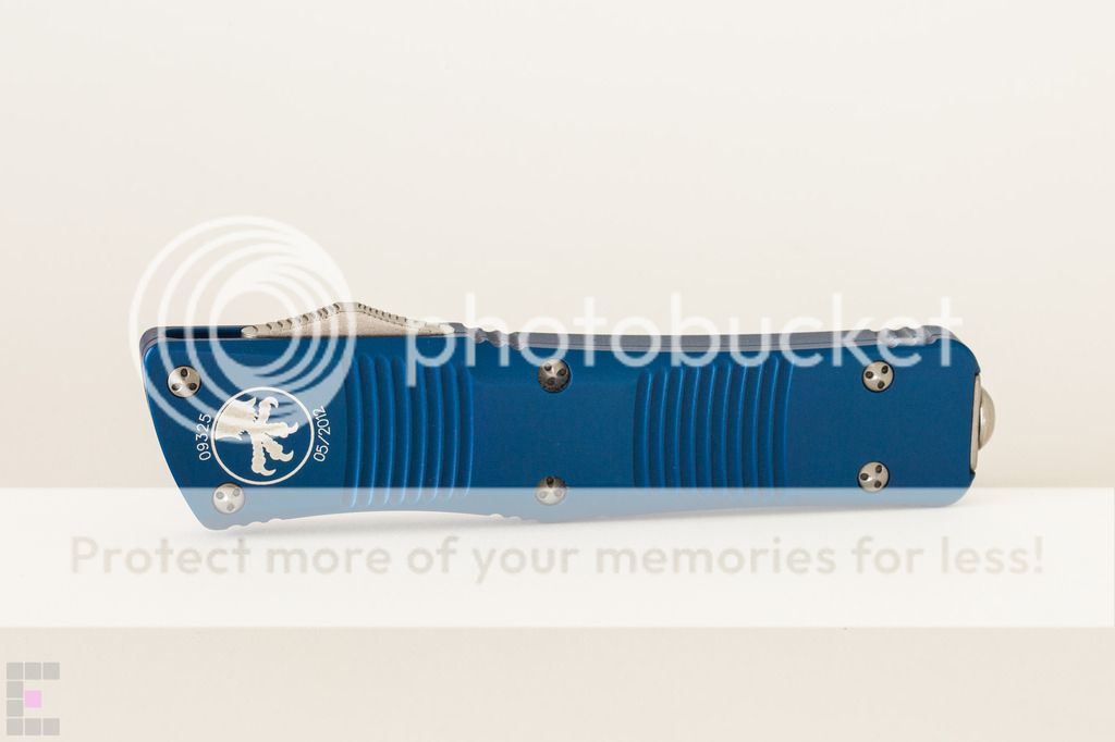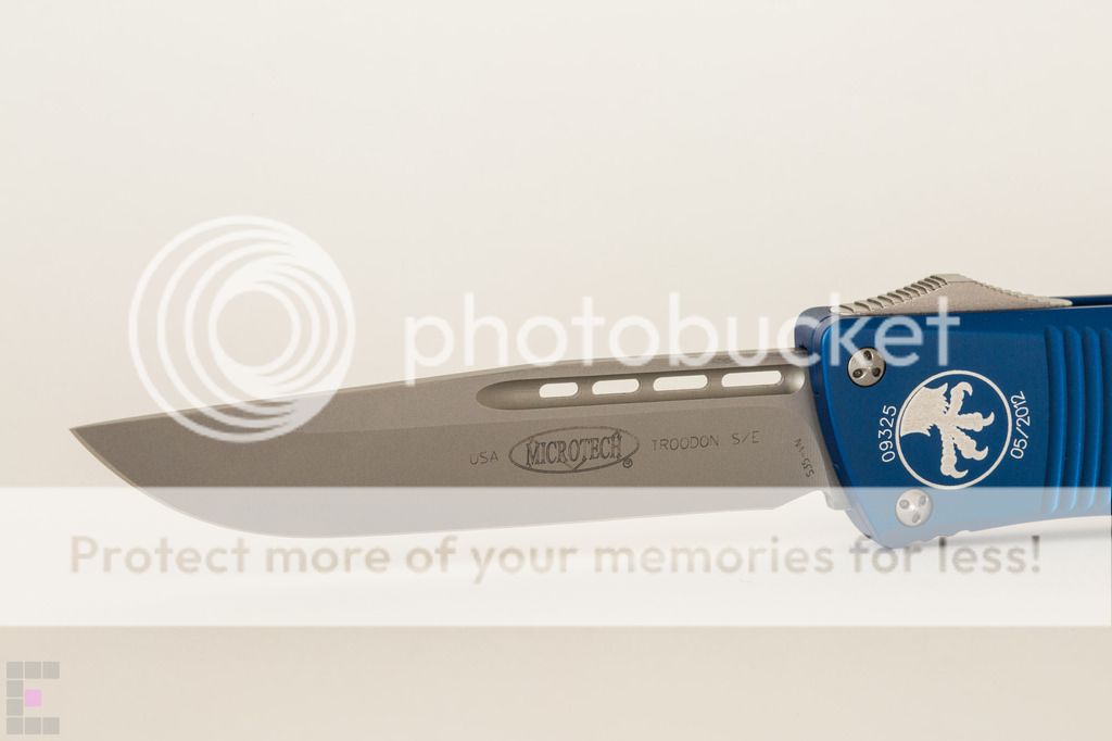 Microtech Troodon Plain Edge Bead Blast $300: This knife has been babied and is in primo condition, never used to cut a thing. Only 2 minor flaws...3 if you count the dust on it. Note in the 6th photo down there is a dark spot on the side which appears to be a miniscule manufacuring flaw under the blue anodized coating. Also there is a tiny scuff/ding/scratch/mark thing where I must have bumped my phone or flashlight with the front edge, see the 7th photo down (small white mark in the top right corner) The knife has a cap screw installed for better edc, ships with original glass breaker tip, box, nylon sheath and paperwork. Paypal fees and shipping included SOLD No trades at this time and I am FIRM on the price as I am tempted to keep this one because it is so damn sexy.