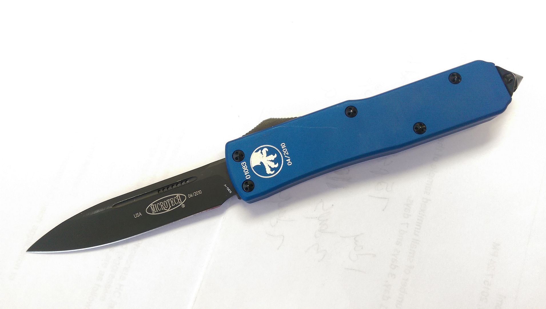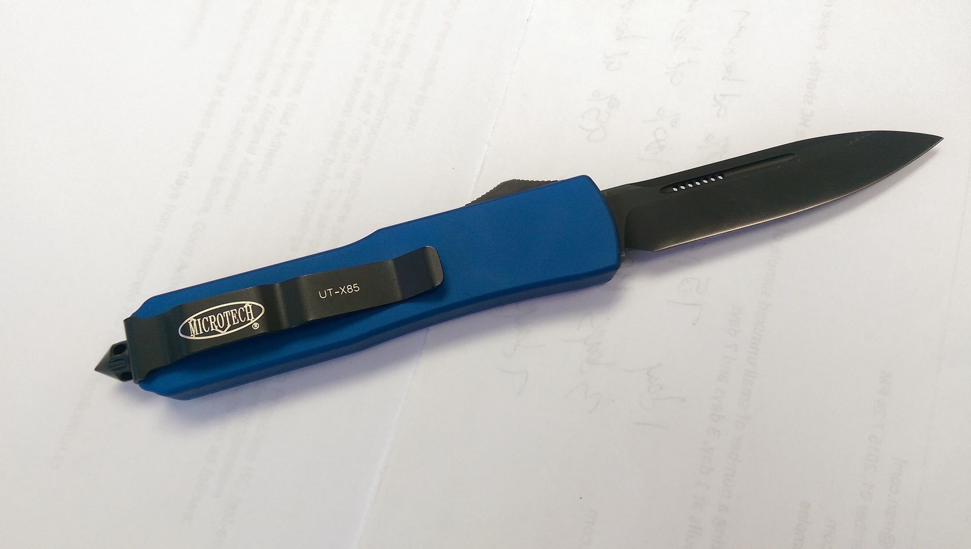 I have for sale my safe queen Microtech UTX-85 SE Blue Standard Model 125-1BL. The serial number is 018083. The production date is 04/2010. The blade is single edge S30V coated with DLC. I purchase this as BNIB, and I have only carefully admired and fondled it occasionally; the rest of the time it has been stored with the rest of my knife collection. Includes original box, nylon belt sheath, paperwork, and blank warranty card. Asking $230.00 net to me shipped via discrete PayPal payment.