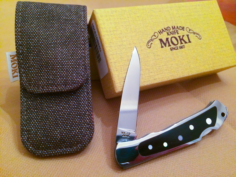 Moki Serapis Green Sea Snail & Gold Shell. LNIB. Beautiful lockback with mirror VG10 blade, mirror bolsters, black G10 and rare marine inlays. Carried a few times in its belt pouch, but never used (except to for a sharpness test on some paper). Includes original box, brown leather(ette?) and OD canvas belt pouch with snap, and packing materials. All colors you see in the steel are reflections in the mirror polish. Made in Japan. $80 net.
