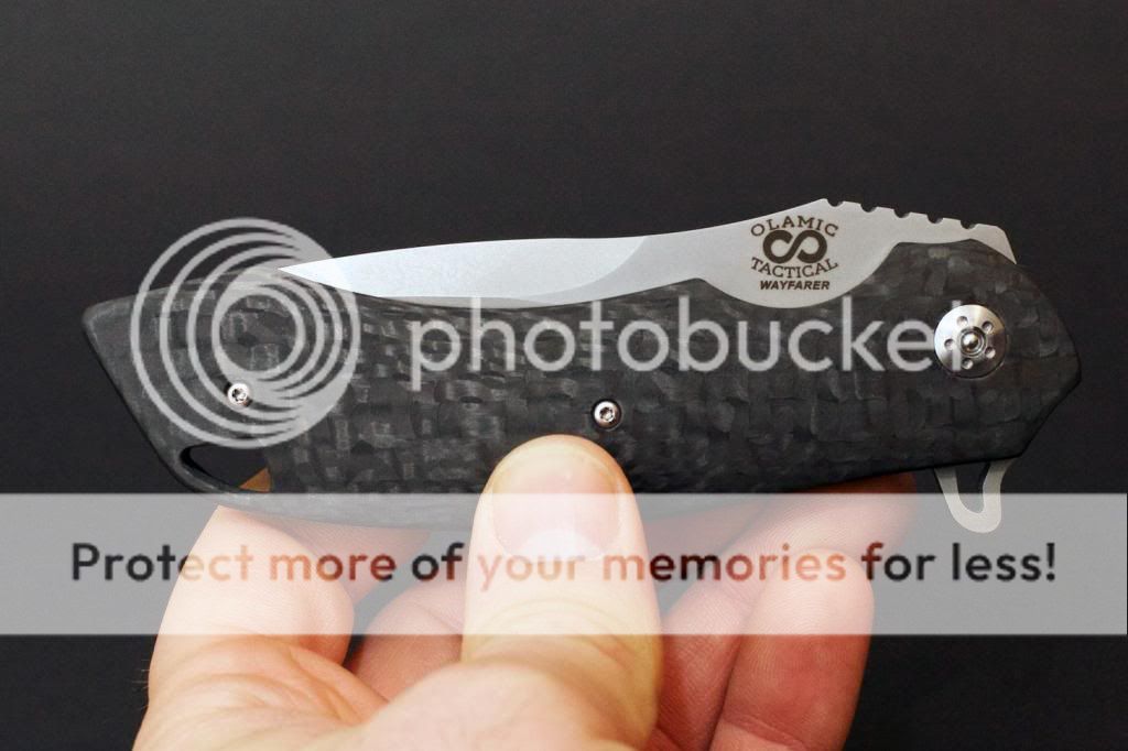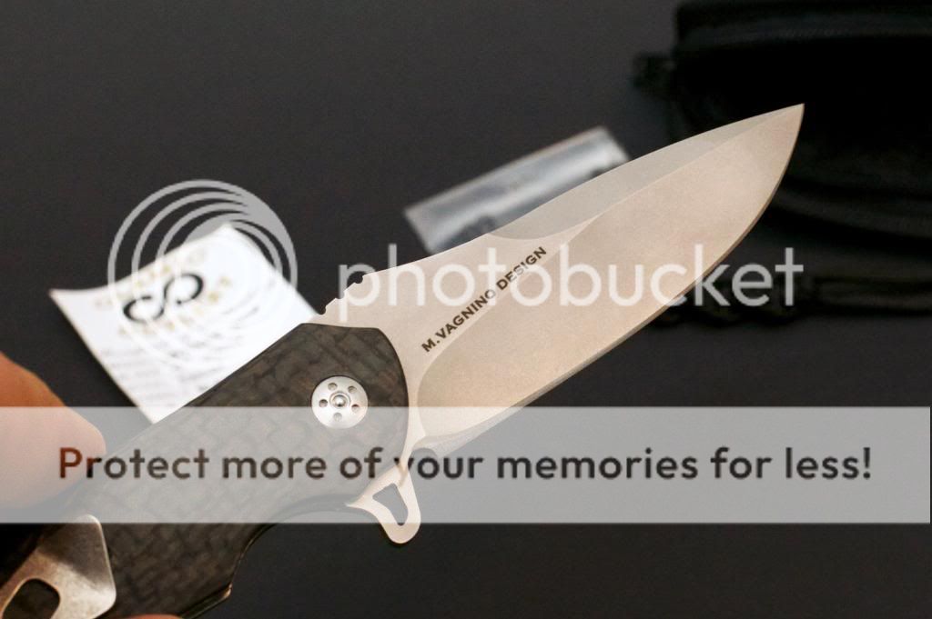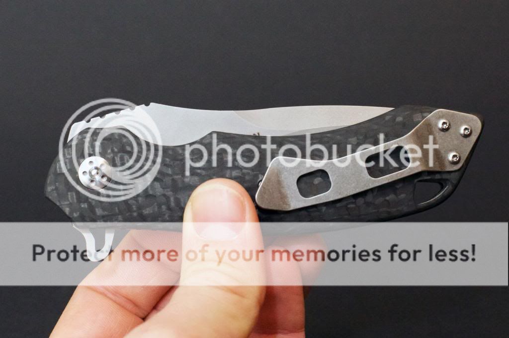 4″ hand-ground S35VN blade with matte finish on a caged bearing, titanium liner lock, titanium backspacer, stainless clip for tip-up carry. Blasted CF handle is amazingly grippy.