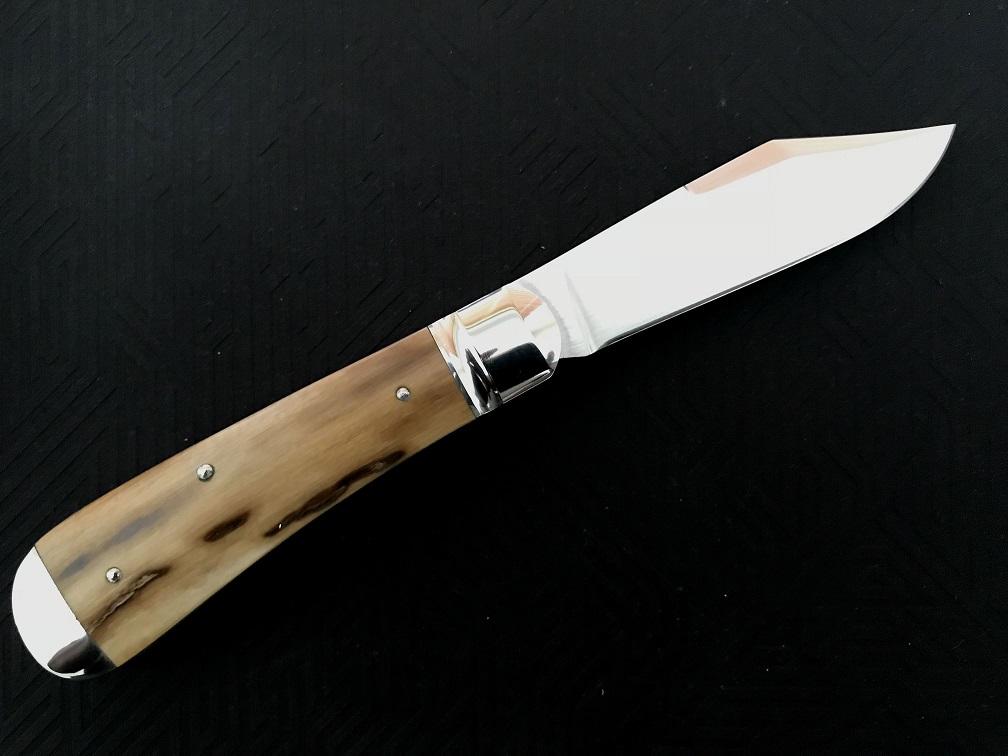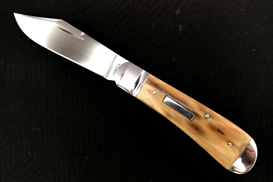 Beautiful custom Hiroaki Ohta double bolster gents fossil mammoth slip joint folding knife in stainless ATS-34 and presentation bark mammoth. Polished stainless steel escutcheon, liners and bolsters.