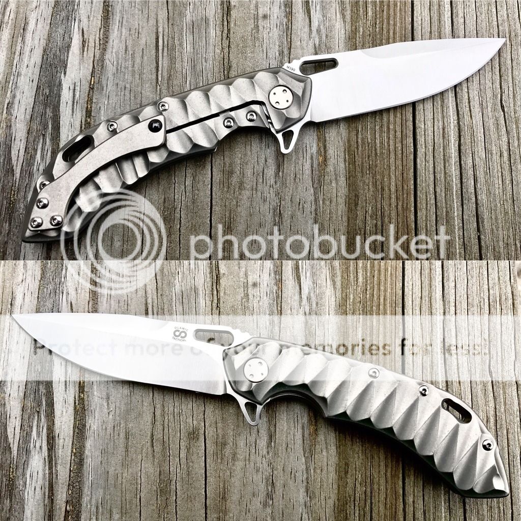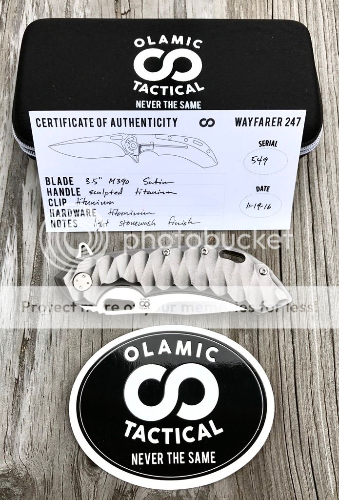 Up for sale tonight I have an Olamic Wayfarer 247. It's brand new in box direct from Eugene. The sculpted titanium scales are lightly stonewashed and absolutely gorgeous. The 3.5" blade is newly upgraded M390 steel. Just an incredible specimen of an awesome knife. Centering and lockup are perfect. All hardware - pivot, screws, pocket clip are Titanium. These were originally listed at $450, and sold out quickly.