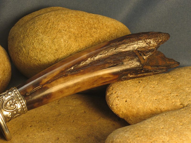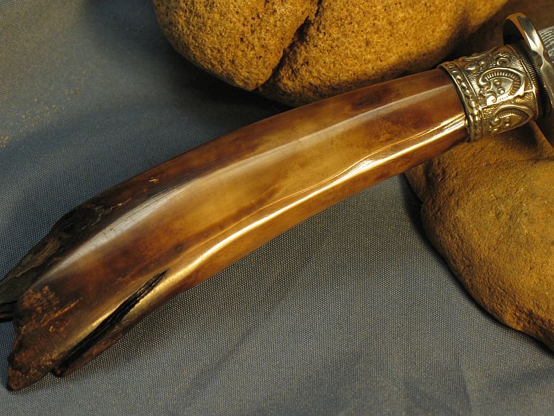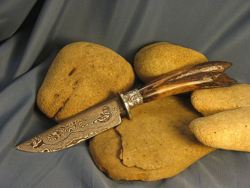 This is one I just completed of Fossil Walrus ivory , nickel silver, sterling silver ferrule and my Damascus of 1084 fine grain and 15n20. The handle is a nice tusk tip with natural end as it came out of the ground. Broke ends like this that are good and solid are rare to find. SHARP! Blade length is 4 1/2 inches and overall length is 9 1/8 inches. Nice leather belt sheath included. Any questions please ask. 225.00 and 6.00 priority mail in USA. My e-mail and paypal is dangraves4923@earthlink.net And Yes, I Hope you like it as much as I enjoyed making it.