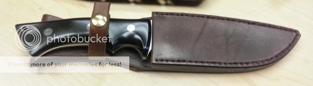 Hi, Guys selling one of my fixed gems a Phillip Patton camp utility knife. It is new and unused oiled and displayed only. 01 Steel Hardness: 58-60 Rc, Blade length: 5-3/4", Total length: 11-1/8", Blade thickness: 3/16" Handle material: polished black paper micarta fittings: stainless bolts with Brown leather sheath included.