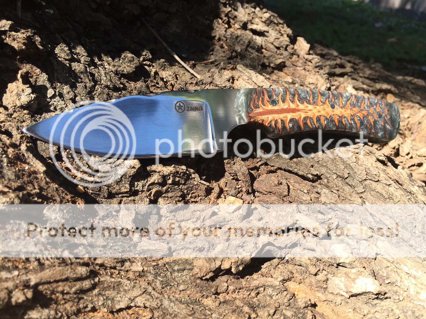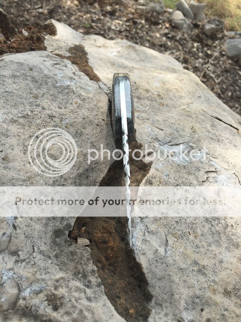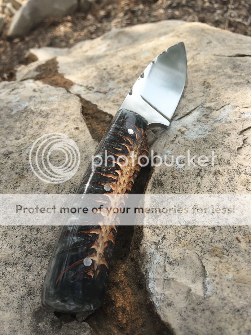 Fresh off the Grinder... Stainless drop point and pressure cast Northern Spruce scales. Vine file-work along the edges spine