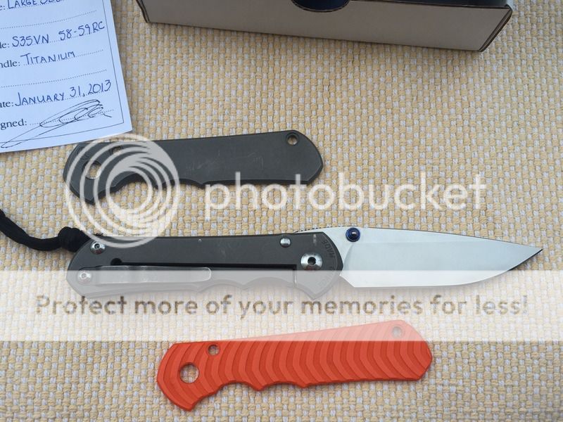 This knife was a user and the edge has been resharpened once on my edge pro. The knife functions perfect with rock solid lock up and blade centers perfect, and it's very sharp! Comes with all paperwork, tools, and the original cardboard box packaging. Knife includes 2 very well made aftermarket scales shown, a carbon fiber on the knife now and a orange G10, plus the original factory Ti presentation scale of course.