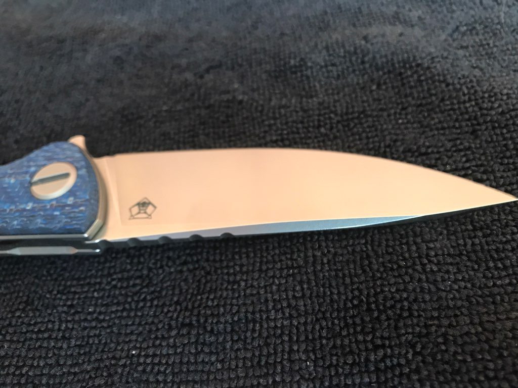 Dept. 13 blue scales are incredible in person, hard to capture in a pic. Single row Roller Bearings are simply sublime. I am a Shiro guy that always preferred the SRB setup to the MRB - this is somehow the best of both IMHO. Original bronze CF scale and Shiro MRBS, box and and authentication card included. There is a tiny mark on clip that only shows if the light hits it JUST right (third pic). Otherwise, I cannot see any evidence the blade has ever been used. Feels very sharp to me.