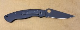 This is the scarcely seen first Knifeworks exclusive titanium frame lock Millie. It features a black g10 show scale and a satin M4 blade. This example doesn’t appear to have any use on it (pristine blade) but show signs of light carry/ handling perhaps. Beautiful action and lock up, it’s a super fine example of an uncommon Spyderco.