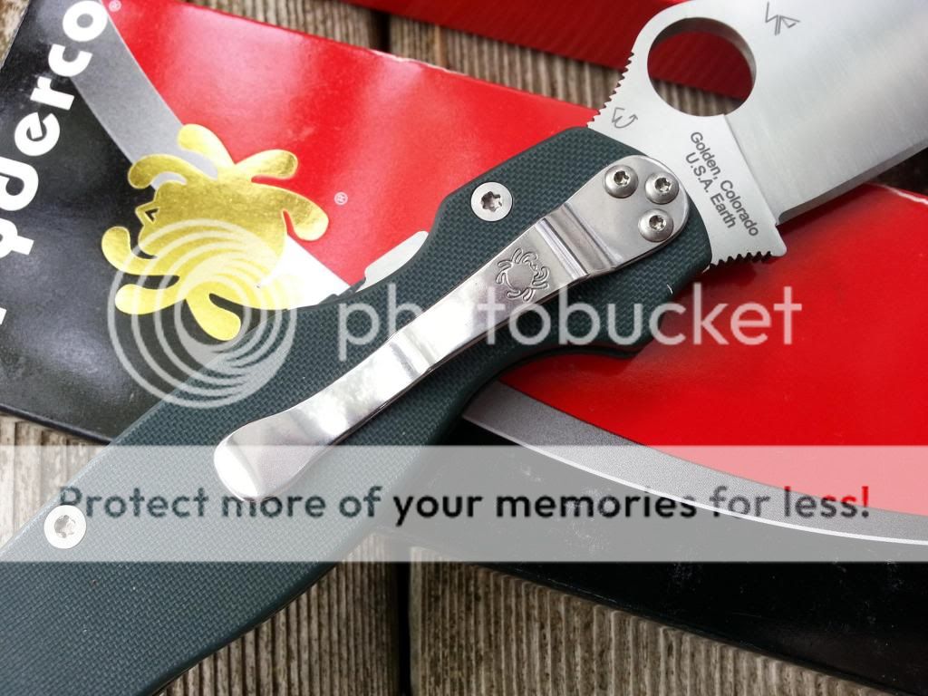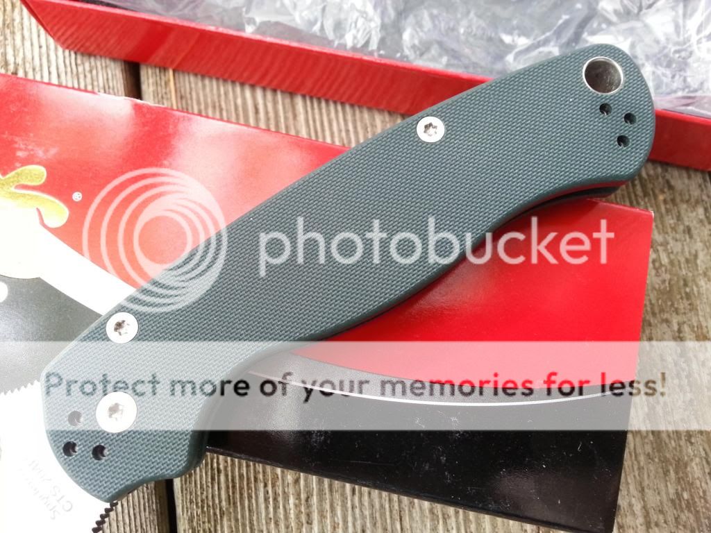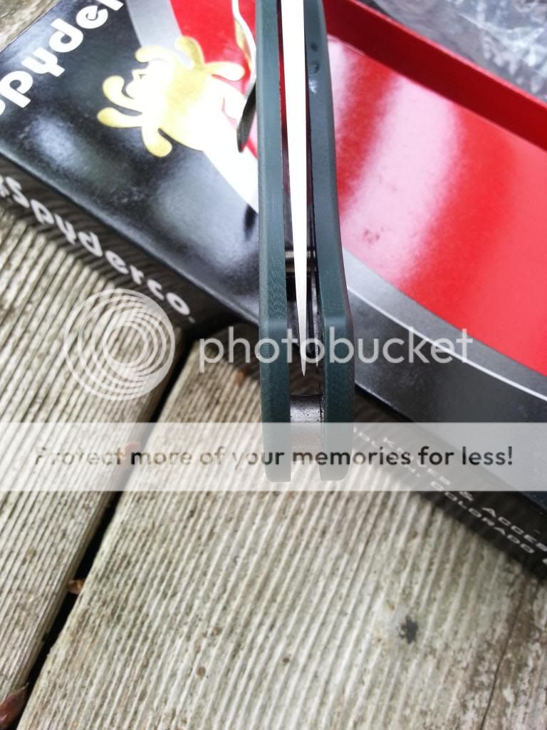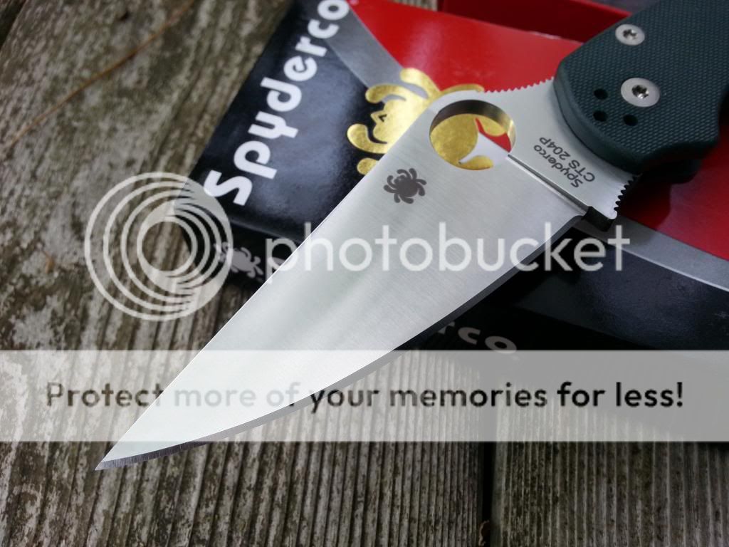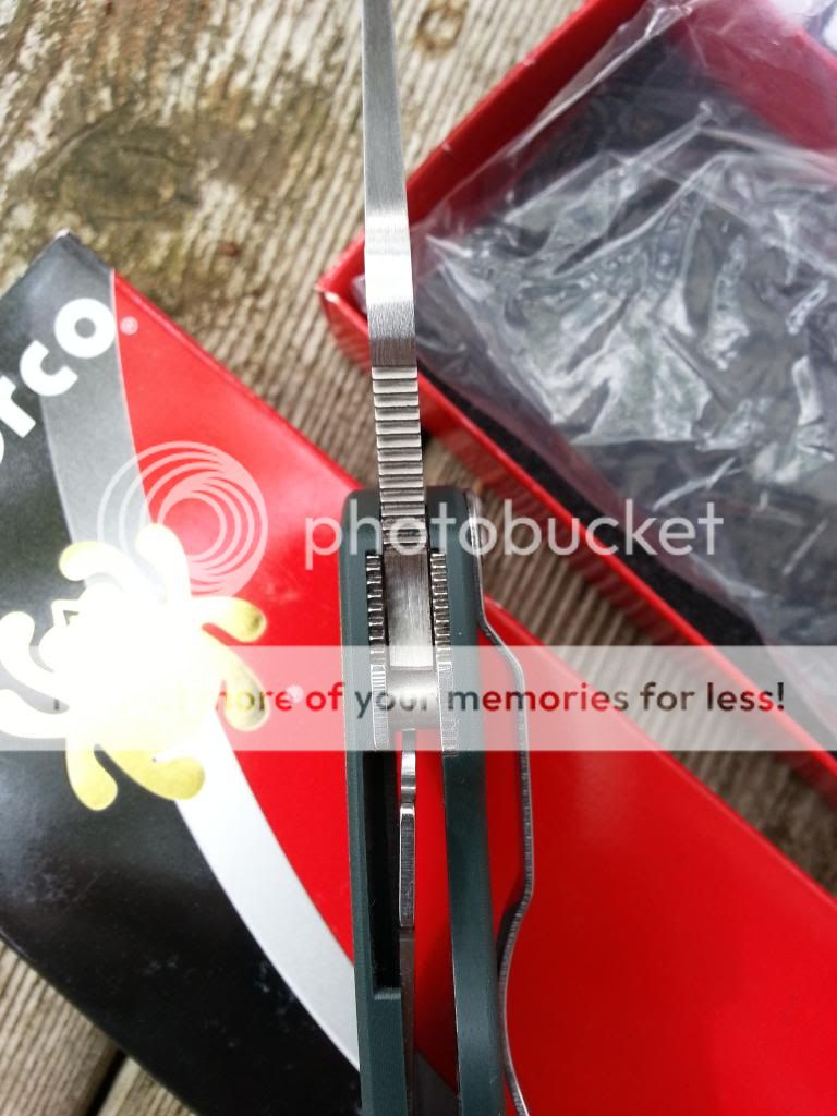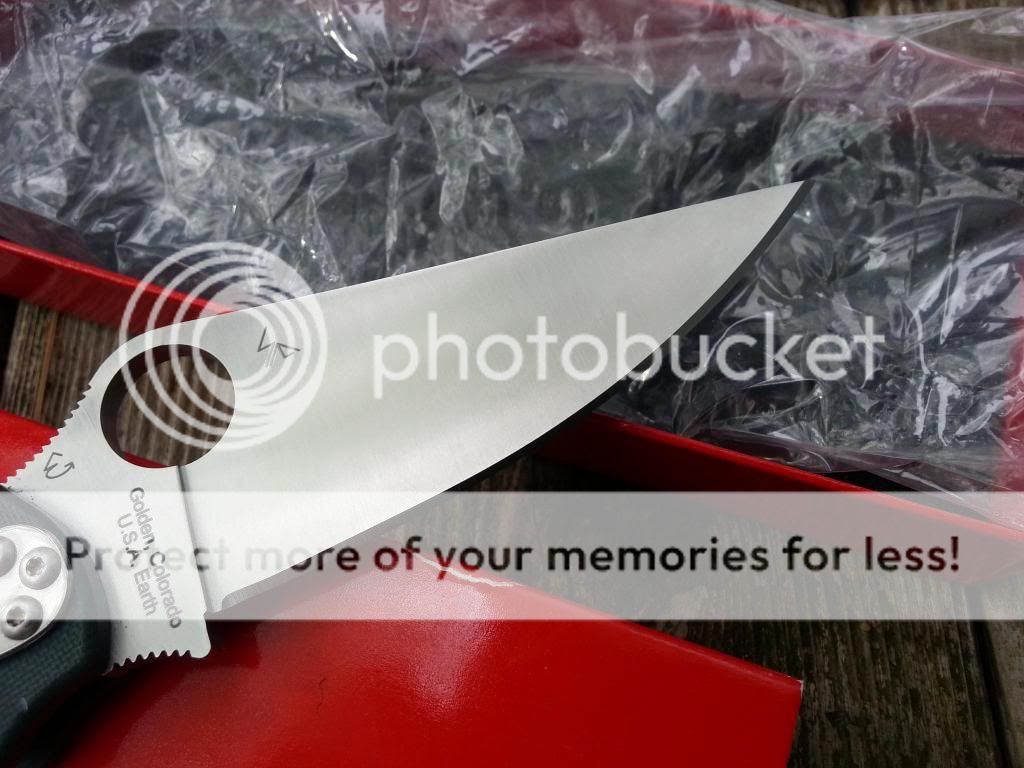 Carried and used just a few times. I examined the knife before taking the pictures and I see little to no signs of it being carried or used except for some lint/dust as seen in the sixth and seventh pictures. Action was a little stiff out of the box so I loosened the pivot as little as I possibly could and now I think it flicks open very nicely. Box has some minor dings and scuffs. See pictures below for close ups of fit and finish.