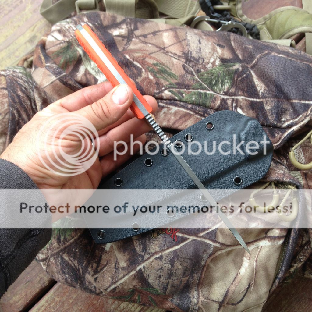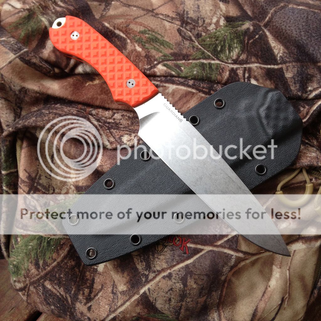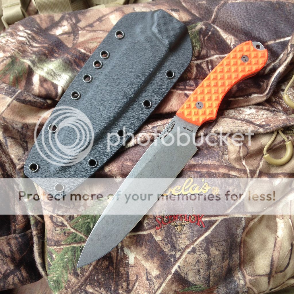 Next up is a Bradford Guardian 6 with orange g10 scales and CPM-3V blade. This one has the sabre/stonewashed blade and tumbled fasteners. Never used but I carried in my pack this summer so orange scales are a little dirty. Blade is nice and sharp and ready to use! Kydex sheath included and it's a very nice fit. Scale color is the same on both sides... it's just the lighting in the one pic that makes one side look lighter.