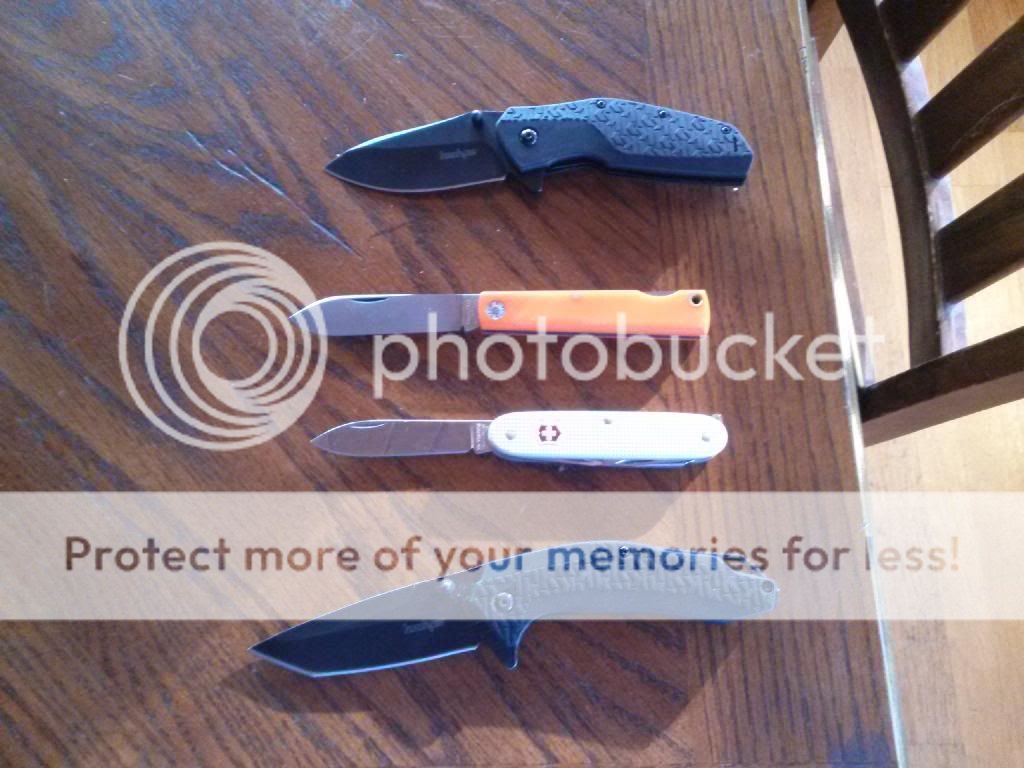 The four knives I am selling are a Kershaw Freefall and Swerve, a GEC #99 in orange delrin and a SAK Alox Pioneer. Lockup is good on all, although the #99 has a touch of side to side and typical up and down like all lockbacks. It is still very sturdy. They show some signs of use but not much.