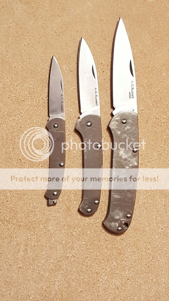 These knives were designed by A.G. Russell as small, extra-thin pocket knives for when you want something that doesn't make a bulge in your pocket. They are roughly as thick as the liners and blades on a regular knife. The build quality is very good, and I believe the blade steel on all three knives is VG-10. The smallest knife is a slipjoint and the larger two are lockbacks. All three knives have been carried and used and are scuffed and scratched, but they have only been used a little bit and other than the cosmetics are in very good shape.