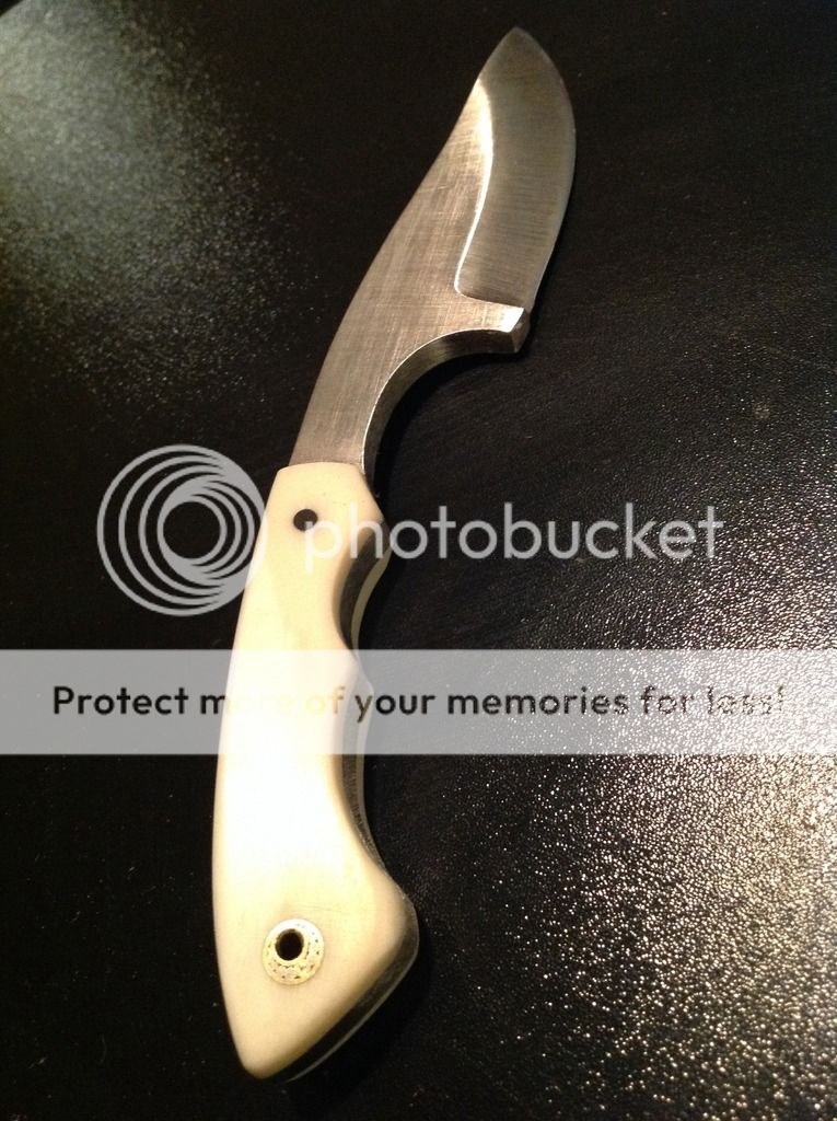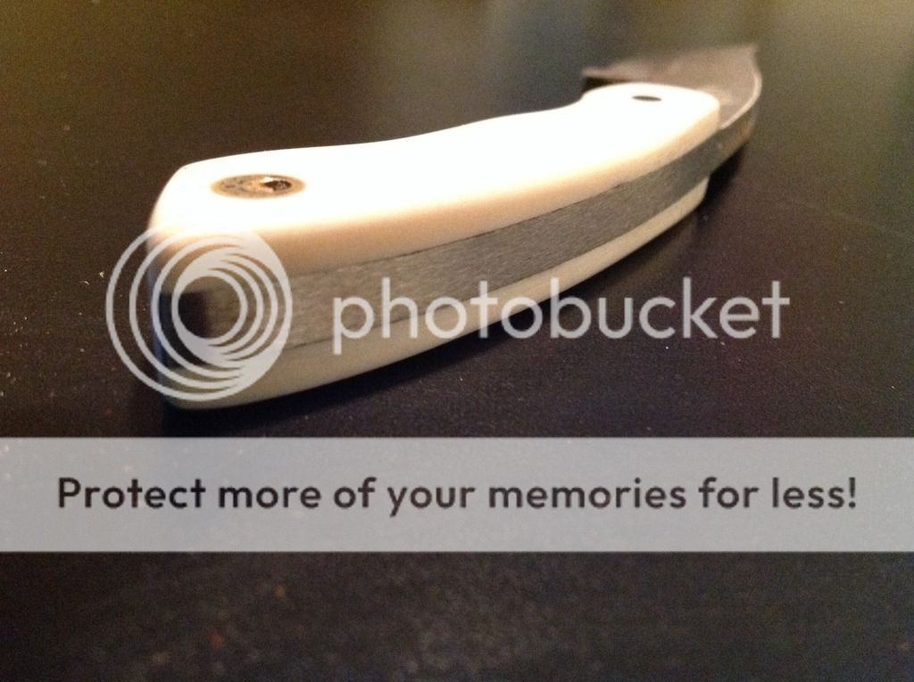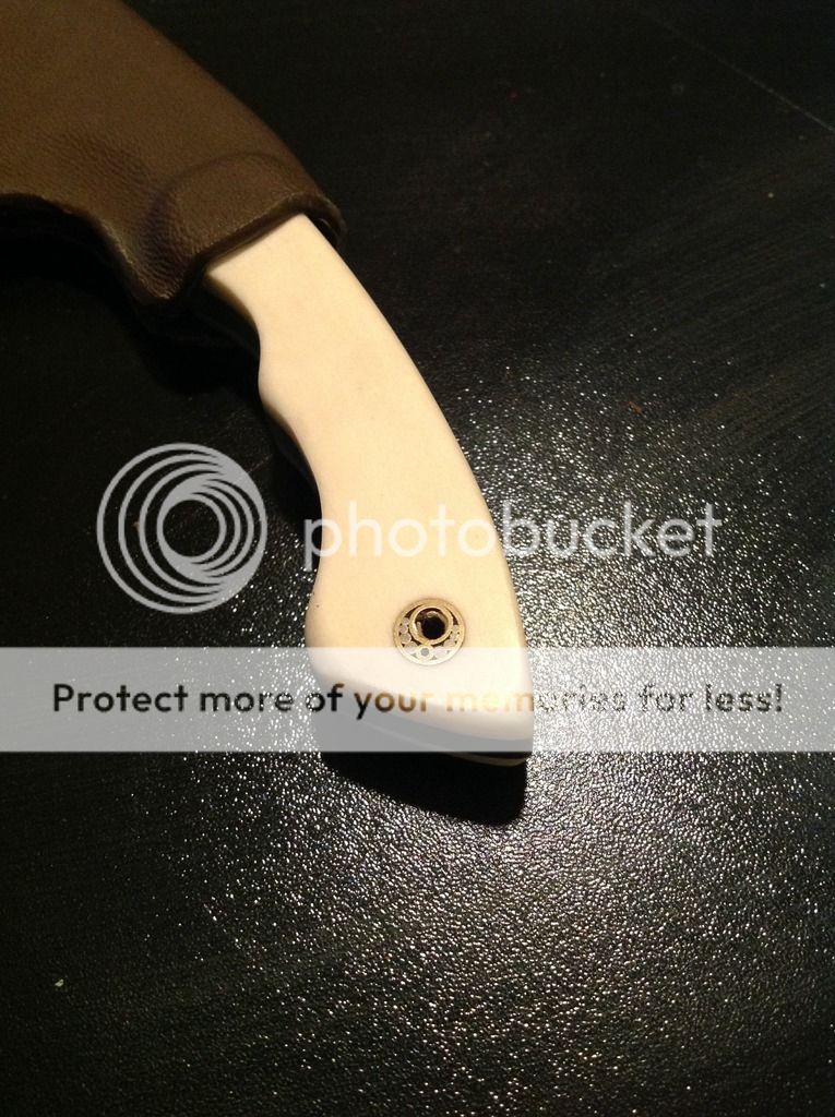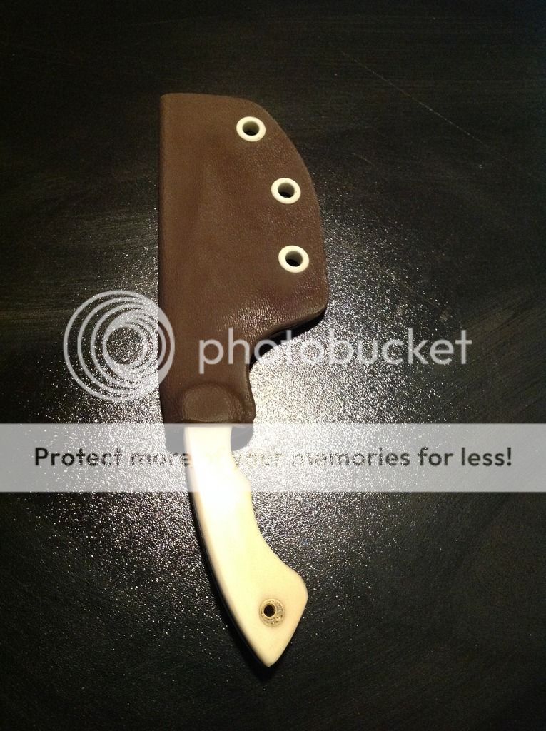 Hi All, today I am offering a beautiful 6 inch OAL EDC from 5/32 O-1 tool steel. The 2 1/2 inch edge is razor sharp and the flats have a brushed nickel look finish. The handles are artificial ivory (really nice looking in person) and has a decorative pin / lanyard. The knife is in a brown kydex sheath with white pins. The sheath has excellent retention and is set up for a small Tek-lok (Tek-lok not included). Asking $old. First "I'll take it" gets it!