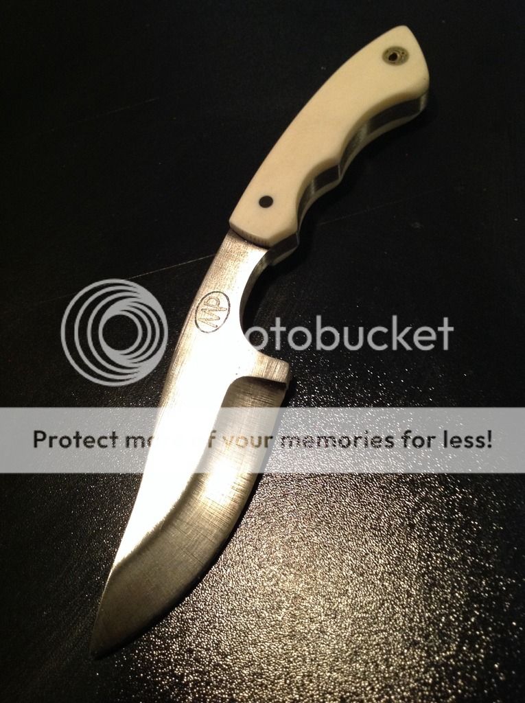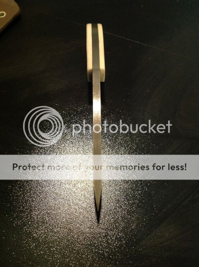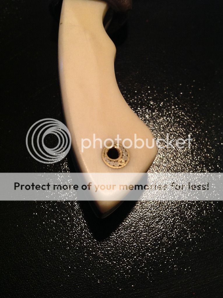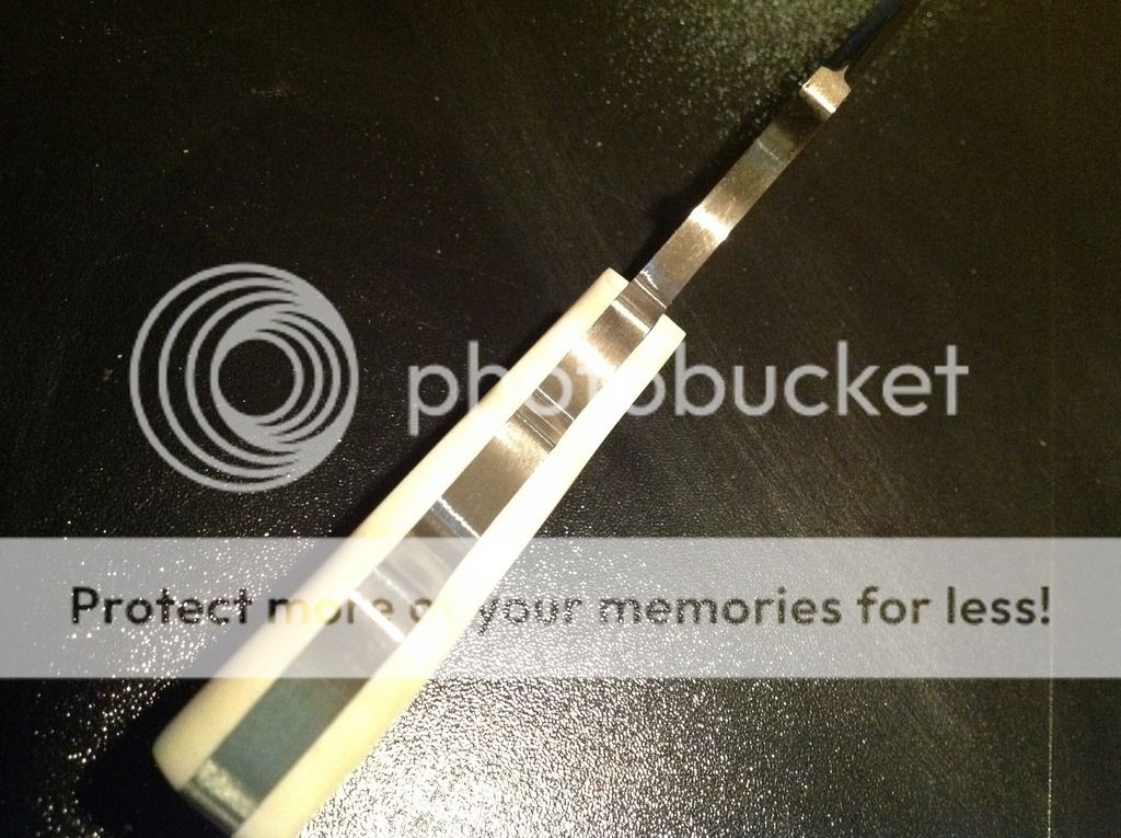 Hi All, today I am offering a beautiful 6 inch OAL EDC from 5/32 O-1 tool steel. The 2 1/2 inch edge is razor sharp and the flats have a brushed nickel look finish. The handles are artificial ivory (really nice looking in person) and has a decorative pin / lanyard. The knife is in a brown kydex sheath with white pins. The sheath has excellent retention and is set up for a small Tek-lok (Tek-lok not included). Asking $old. First "I'll take it" gets it!