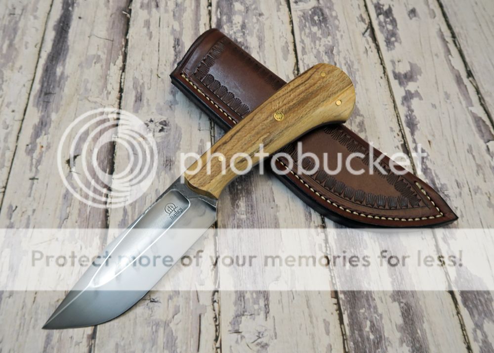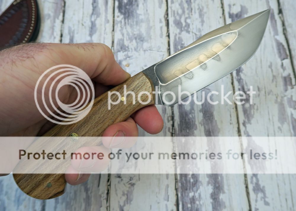 The handle is stabilized sycamore. It is held in place with G-flex epoxy and pins. I have sculpted and polished it to fit nicely in the hand.