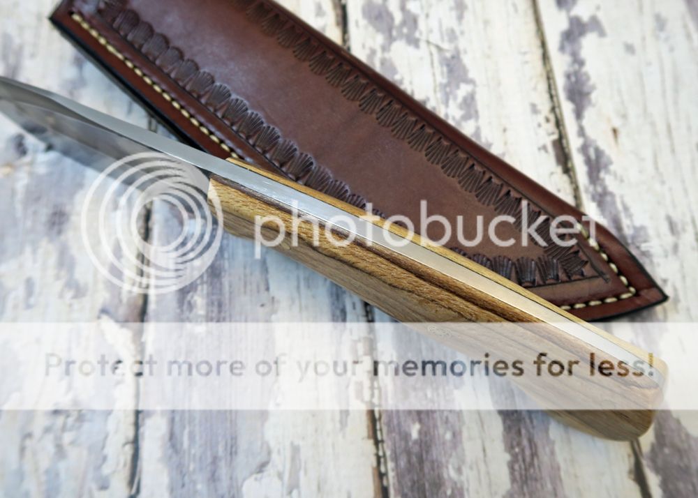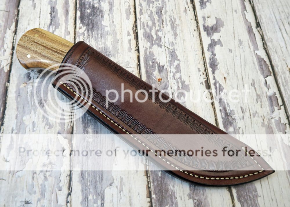 The sheath is 7-8oz hand tooled leather from Wickett and Craig. It fits the knife nicely and it draws easily.